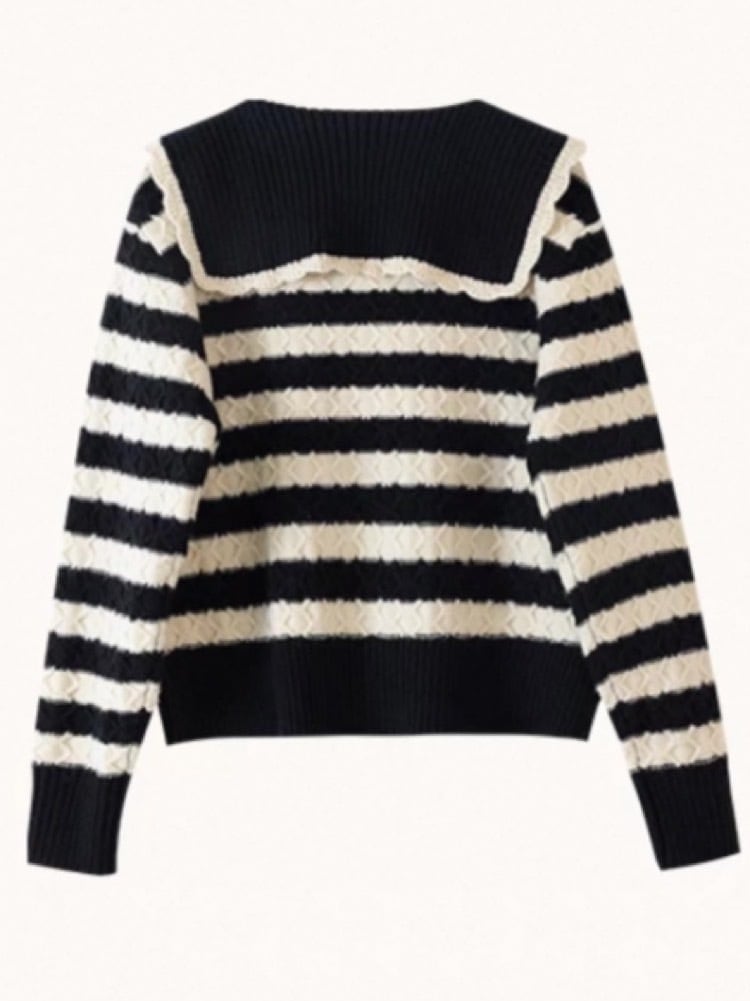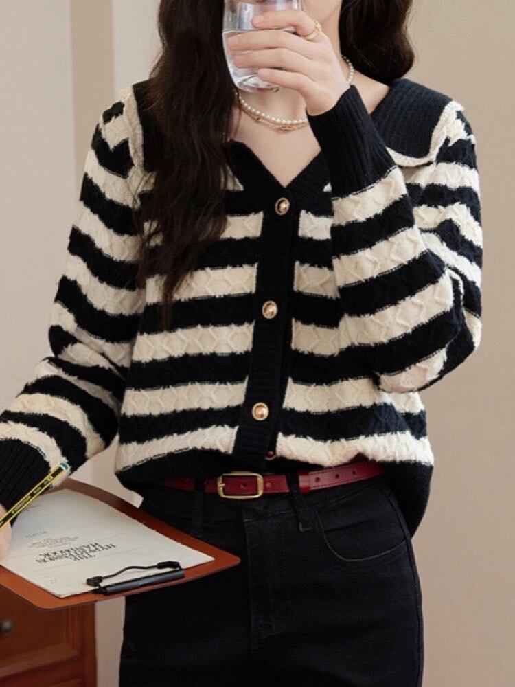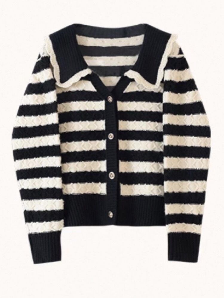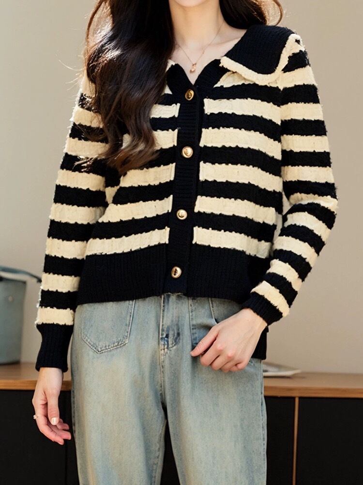 1枚で大人可愛いが完成!ボーダーニットカーディガン カジュアル ゆるシルエット ゴールドボタン こなれ感 体型カバー 大きいサイズ 韓国 CH10425