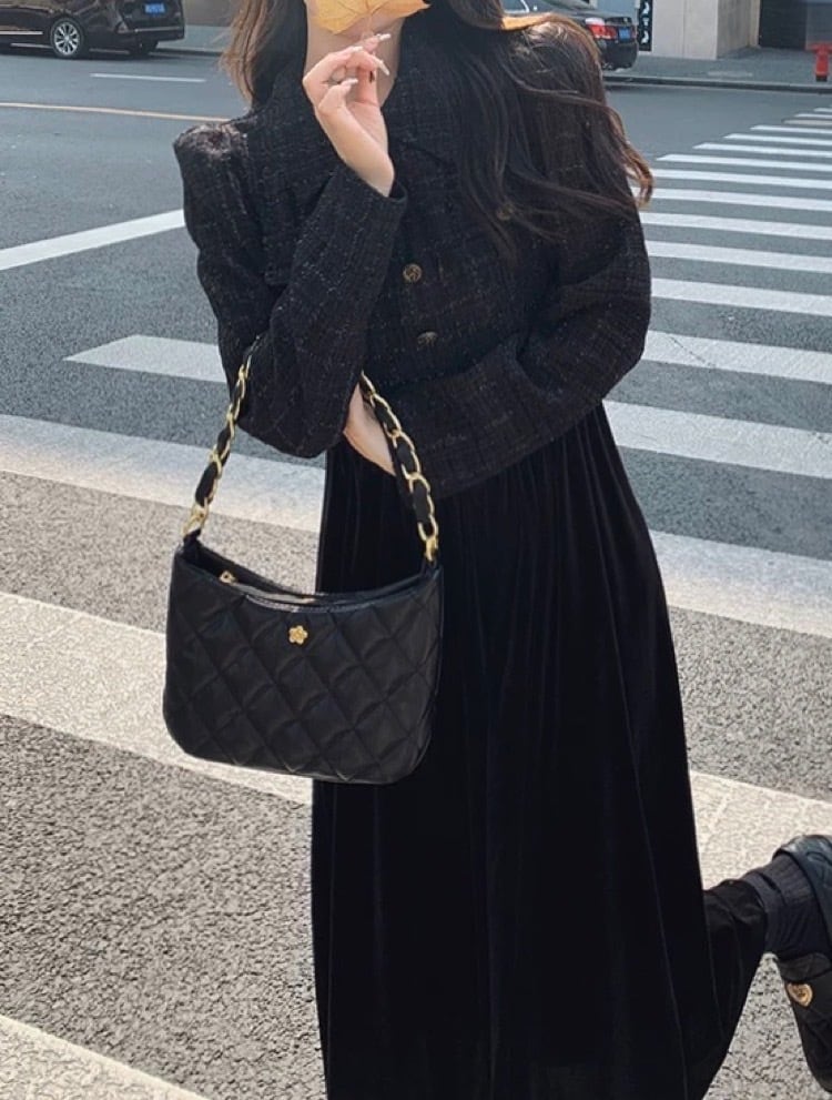ツイード×ベロアの異素材ミックスが上品な、クラシカルムード漂うワンピース。