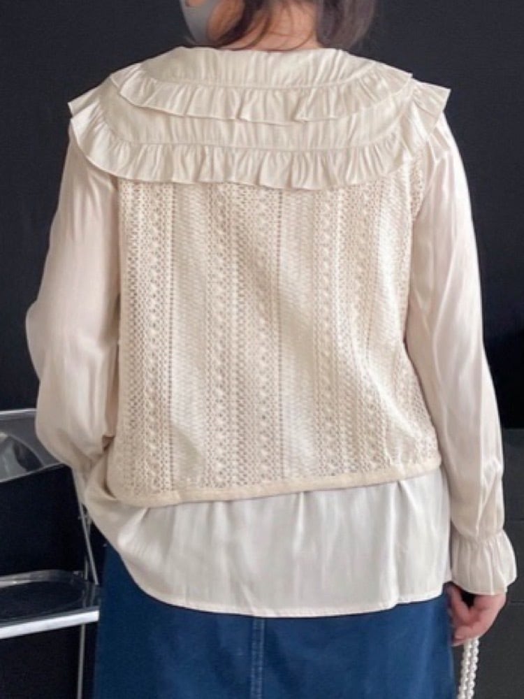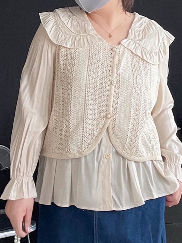 クラシカルな甘さを纏うレースビッグカラーペプラムブラウス こなれ感 レース おしゃれトップス 重ね着風 フェミニン 体型カバー 大きいサイズ 韓国 CH10486