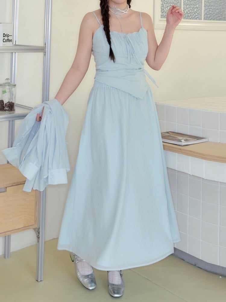 透明感と華奢見えどちらも叶う3点セット エアリーブルーセットアップ キャミソール シャツ スカート リラクシー 着映え 着回し 細見え 大きいサイズ 韓国 CH10570