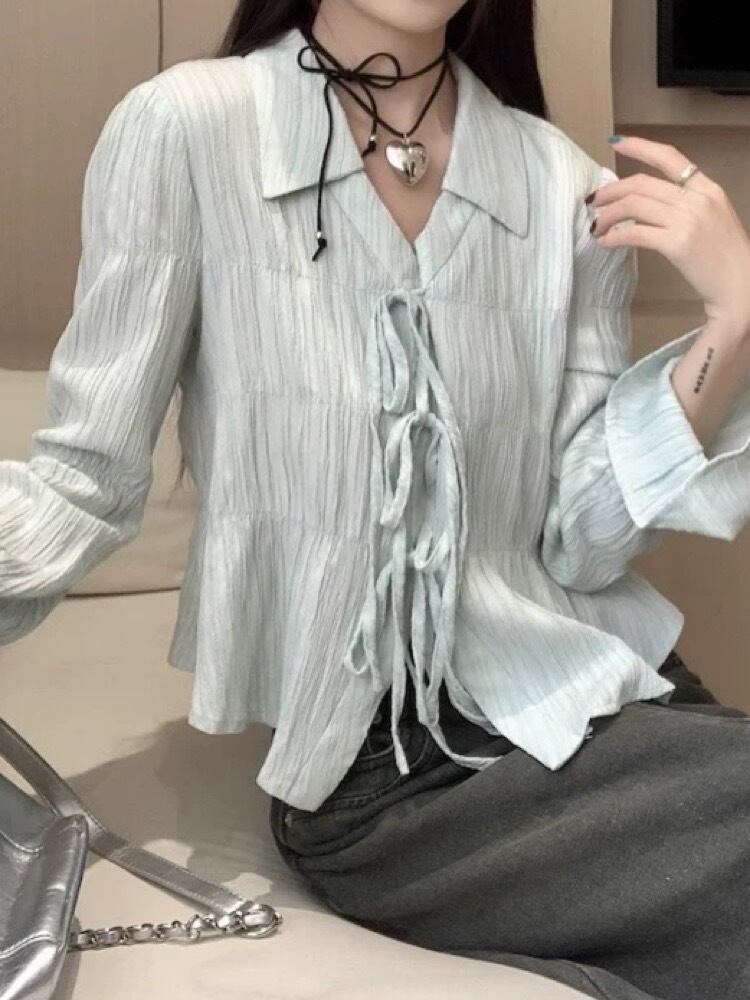 着るだけで華やかなスタイルが完成する、ギャザー×リボンディテールのデザインブラウス。