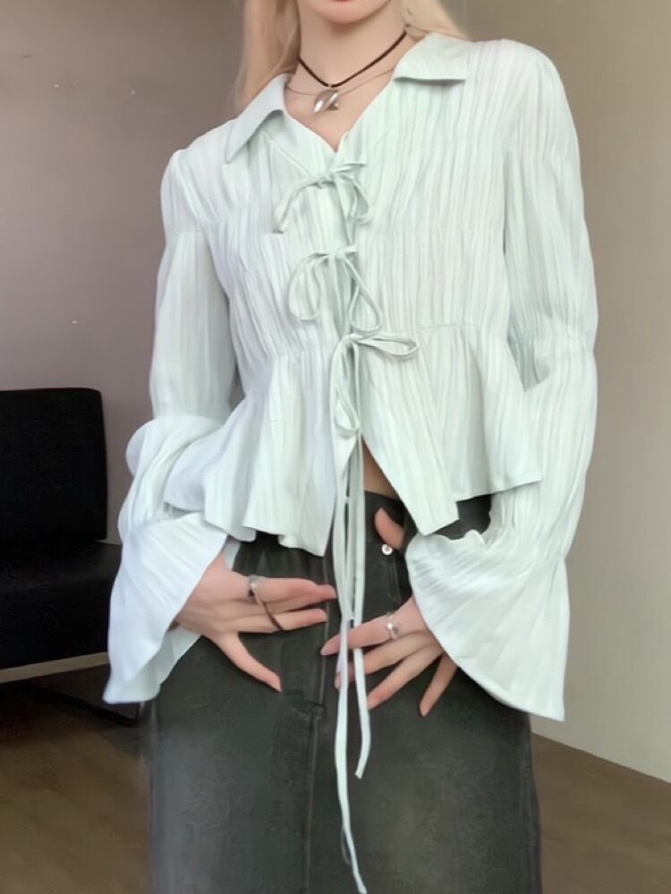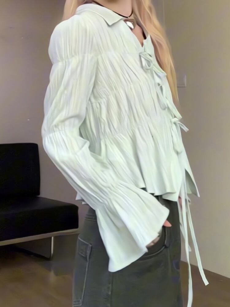 揺れるたび可愛い やわらかギャザーブラウス フレアスリーブ こなれ感 韓国トレンド リボン フロント 大人かわいい 体型カバー 大きいサイズ 韓国 CH10539