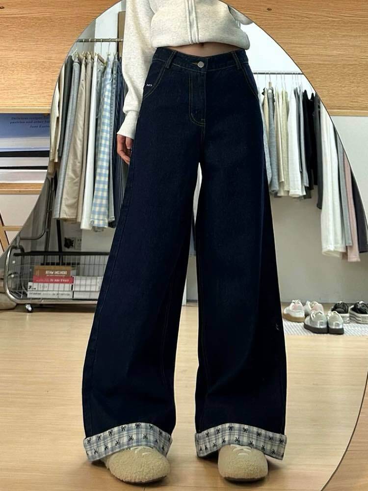 周囲と差のつくキュートカジュアル 折り返しデザインワイドデニム トレンド お洒落 リボン柄 チェック柄 カジュアル ロールアップ こなれ感 脚長 細見え 大きいサイズ 韓国 CH10553
