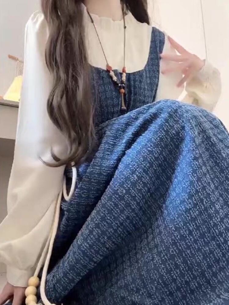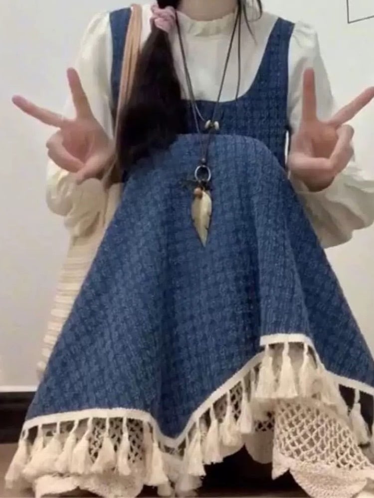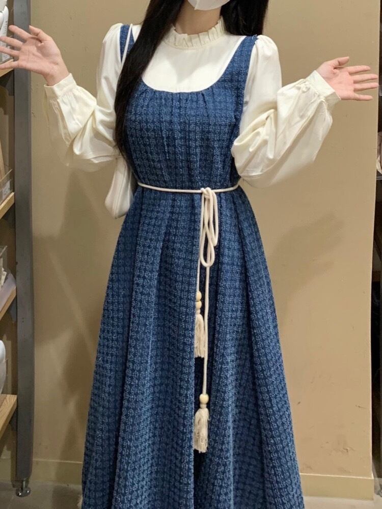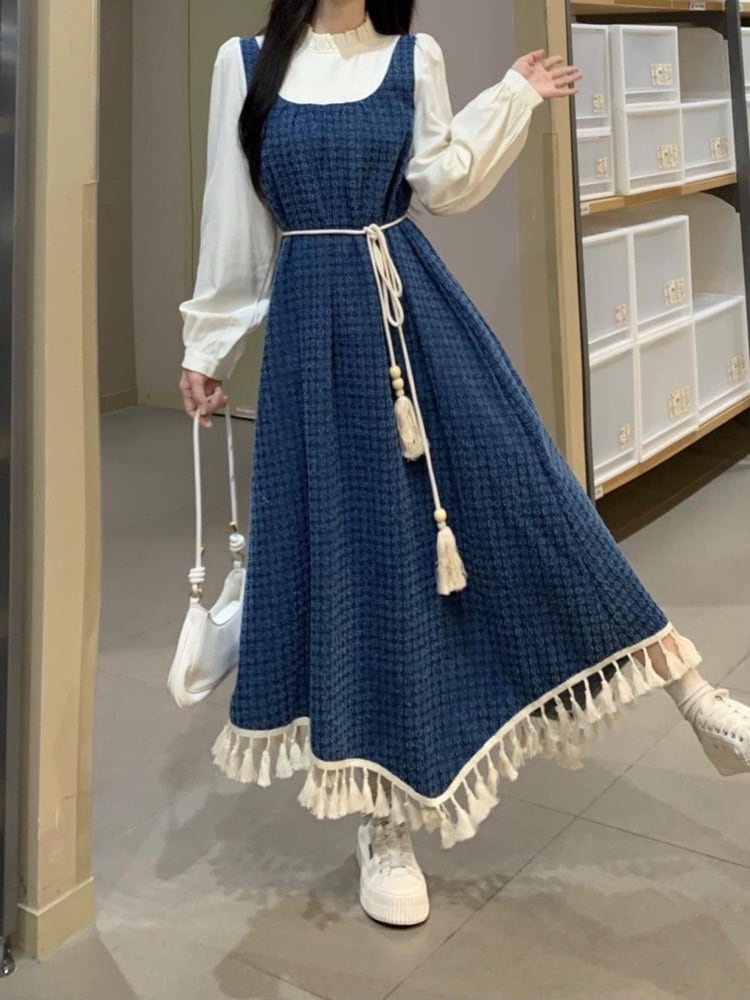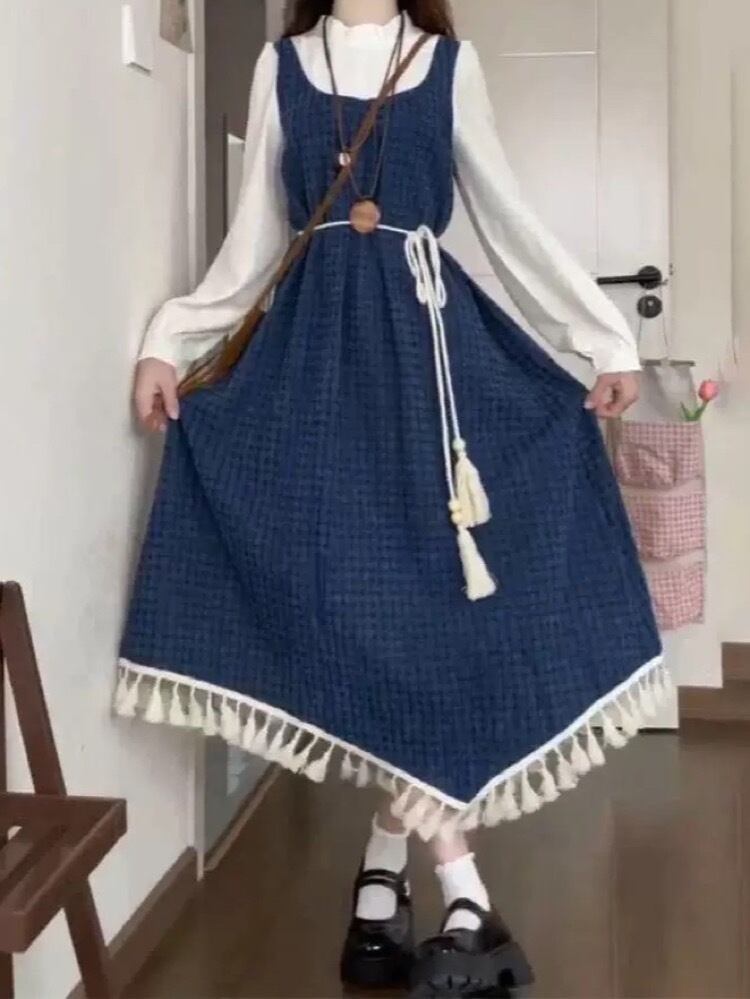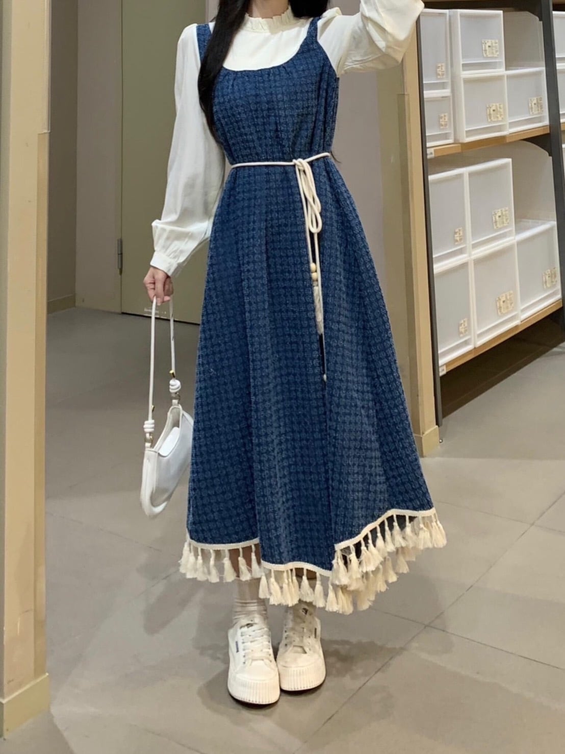 レトロとロマンのいいとこどり♡ チェック柄フリンジロングワンピース ロープベルト付き 大人可愛い 着やせ 体型カバー 重ね着 スタイルアップ 大きいサイズ 韓国 CH10548