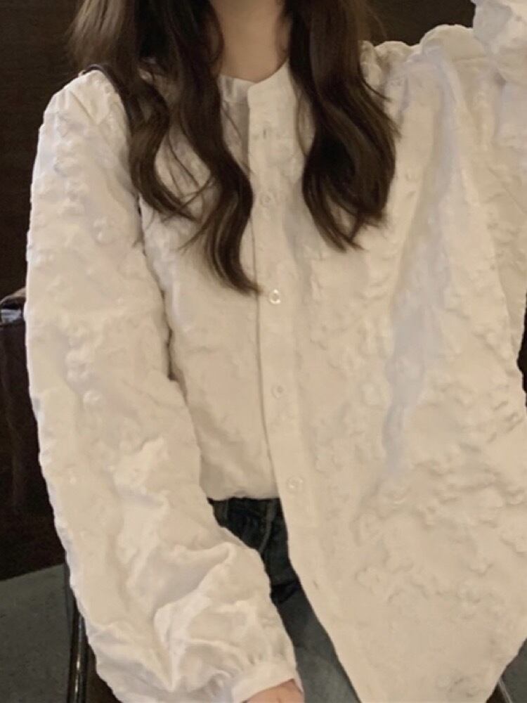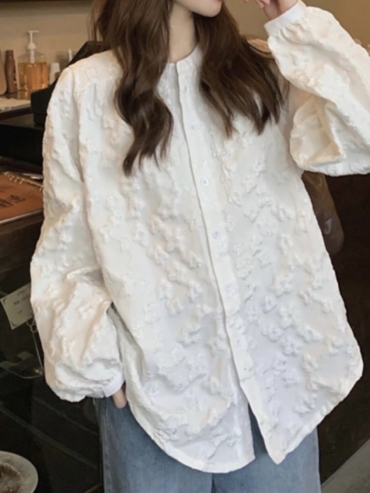 触れたくなるような立体感 フラワージャガード風シャツ ノーカラー ボリュームスリーブ こなれ感 韓国トレンド 大人かわいい 体型カバー 大きいサイズ 韓国 CH10550