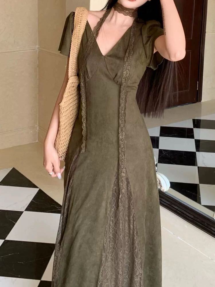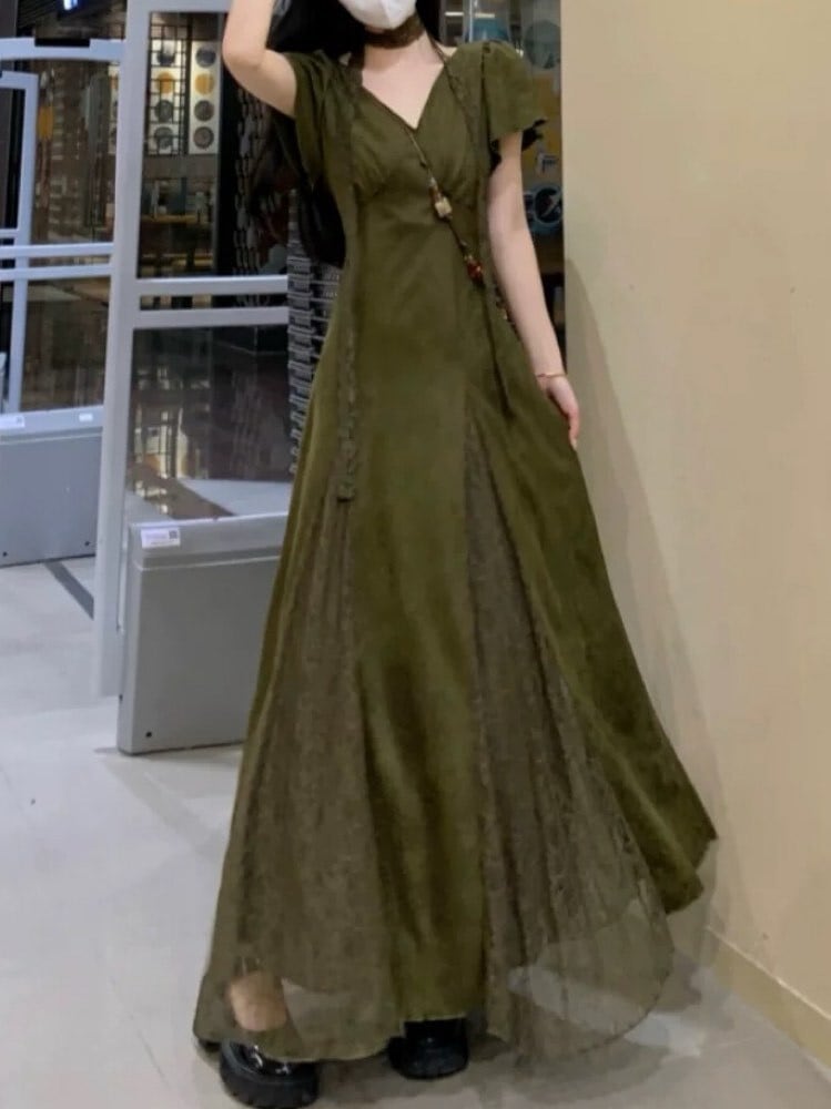 美人度高まる上品シルエット レース切替ロングワンピース 上品 大人可愛い レース Vネック カーキ フレア ロング丈 異素材 体型カバー 大きいサイズ 韓国 CH10561