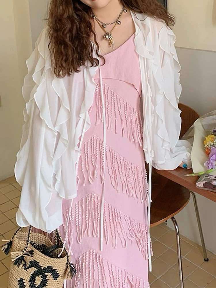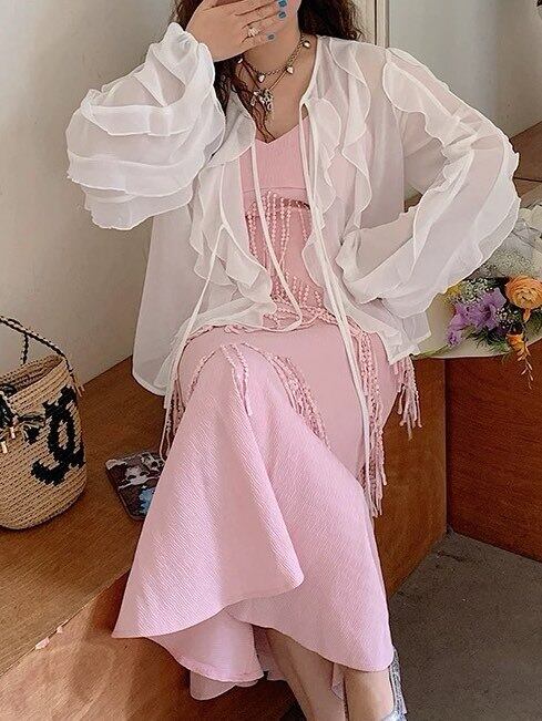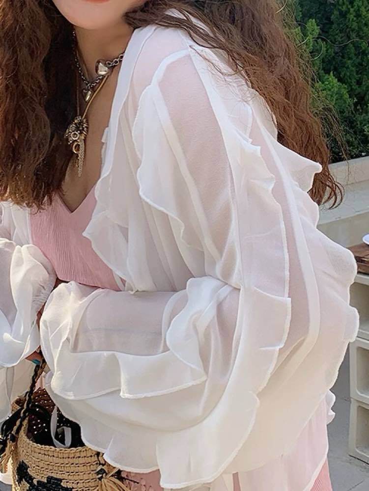 羽織るだけでワンランク上のオシャレに ラッフルフリルシアーカーディガン お洒落 リボン シアー フリル レイヤード 着映え カジュアル フェミニン 体型カバー 大きいサイズ 韓国 CH10626