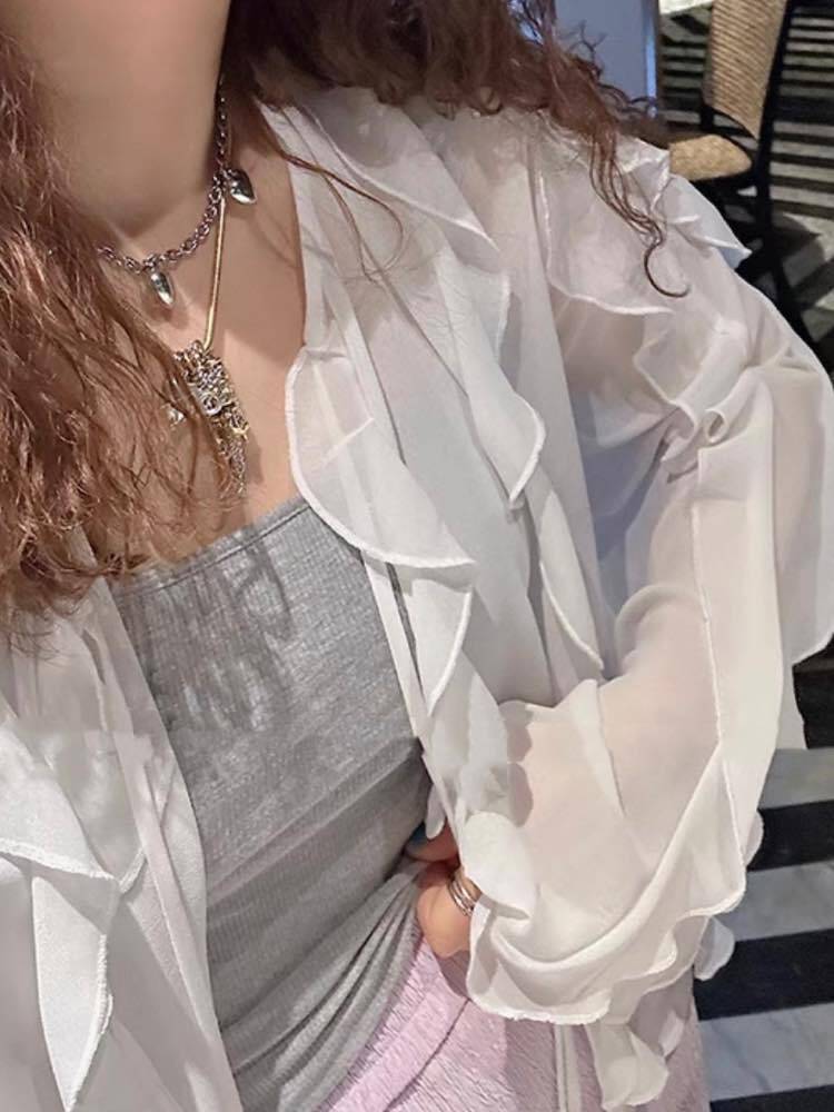 ふわっと軽いシアー素材に、胸元と袖のラッフルフリルが映える主役級カーディガン♪