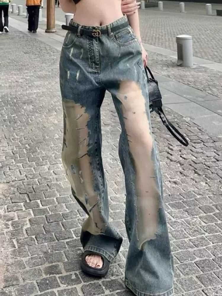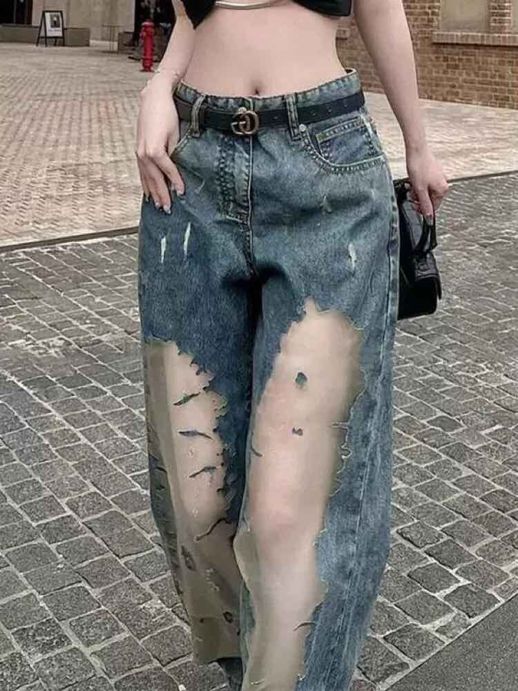 周囲と差のつくシアーデザインで魅了 シアードッキングデニムパンツ シアー お洒落 トレンド 大人 カジュアル Y2K 脚長 美シルエット 細見え 大きいサイズ 韓国 CH10662