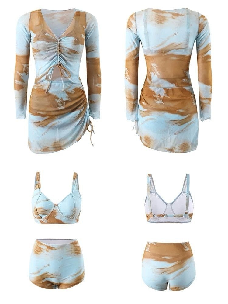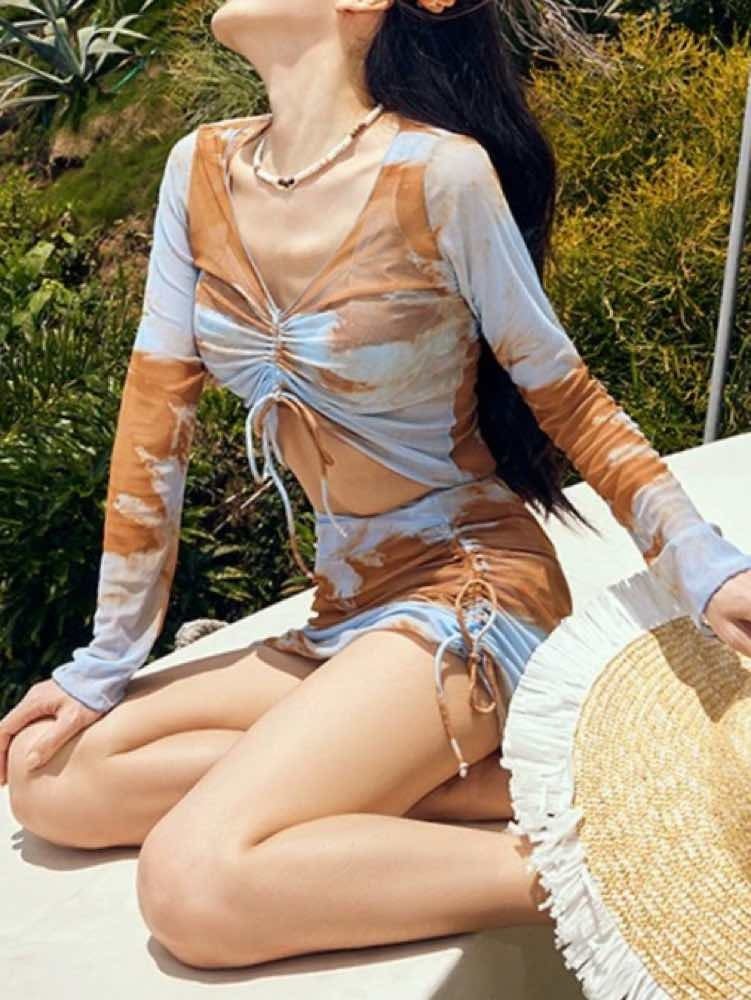 着こなし自在で視線クギヅケ タイダイ柄シャーリングセパレート水着 お洒落 トレンド 大人 リボン バイカラー ラッシュガード スカート パンツ 着映え 着回し 体型カバー 大きいサイズ 韓国 CH10475