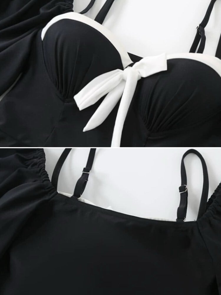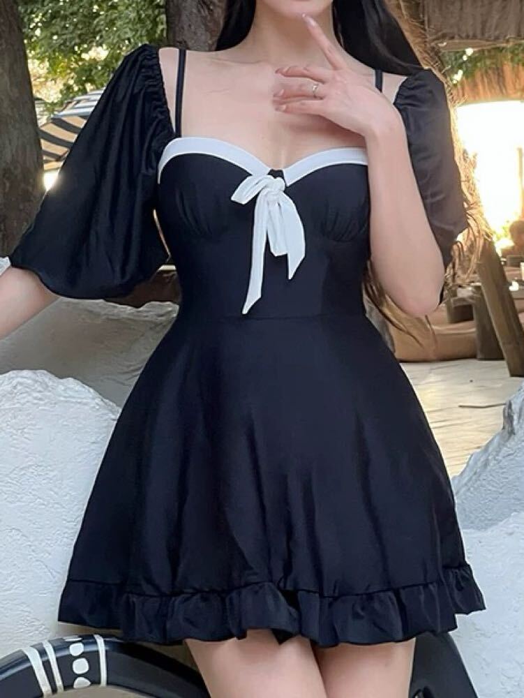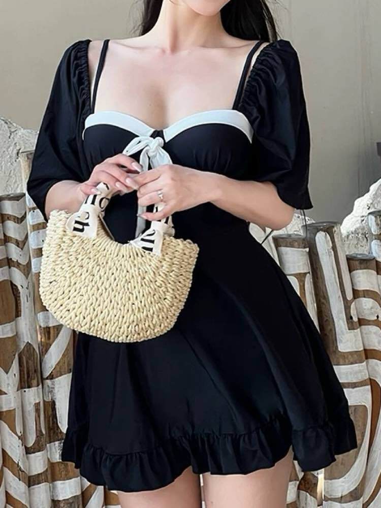 上品なモノクロ配色に、フェミニンなリボンとフリルがアクセントのワンピース水着♡