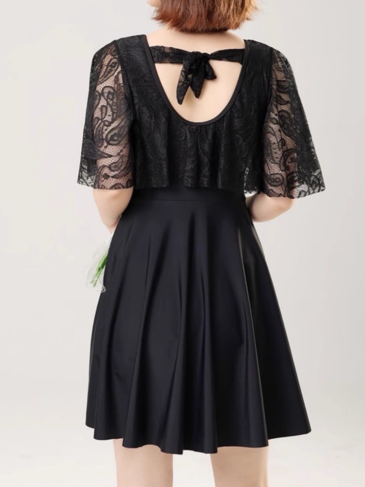 上品レースで肌見せ控えめ レース×ブラックワンピース水着 フレアスリーブ 美シルエット 大人可愛い 上品 フェミニン 二の腕カバー 体型カバー 大きいサイズ 韓国 CH10726