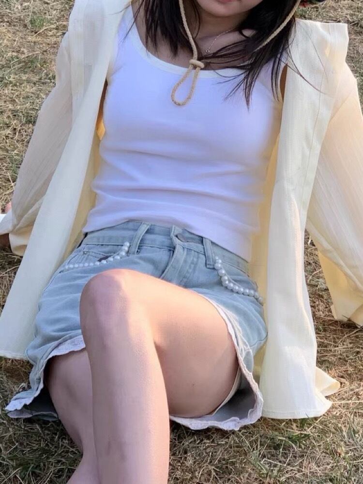 一見シンプルなライトブルーデニムに、さりげないパールとレースのアクセント。