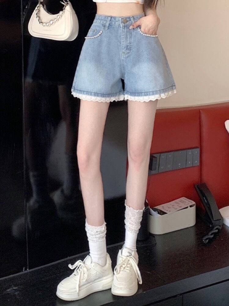 パール&レースで甘さをひとさじ♡ フェミニン映えショートパンツ ハイウエスト きれいめ カジュアル お洒落 着映え 脚長 大きいサイズ 韓国 CH10659