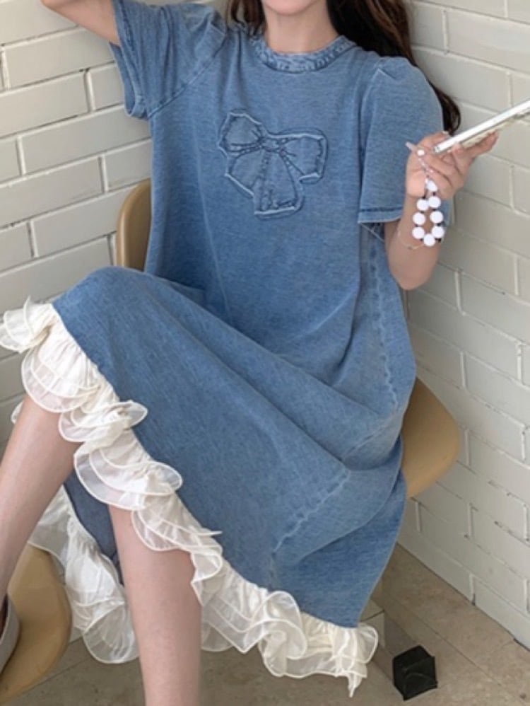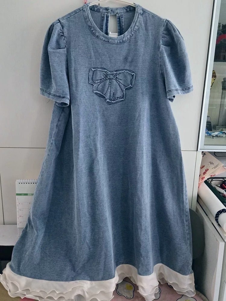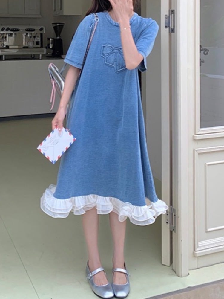 ガーリー×カジュアルの最強バランス リボン&フリルデニム風ワンピース 半袖 Aライン お洒落 大人可愛い フリル カジュアル フリル裾 体型カバー 大きいサイズ 韓国 CH10657