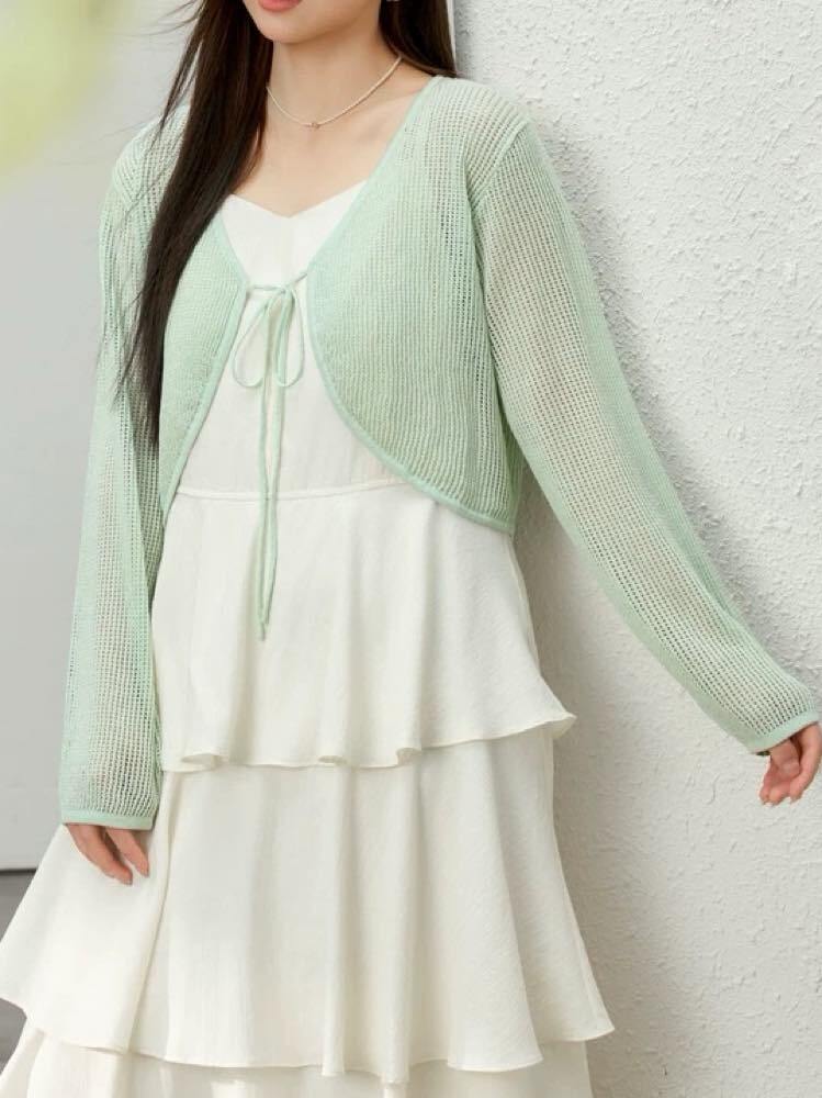 ボレロ風の短め丈がスタイルアップを叶え、ほんのり肌見せで気になるボディラインもふんわりカバー!