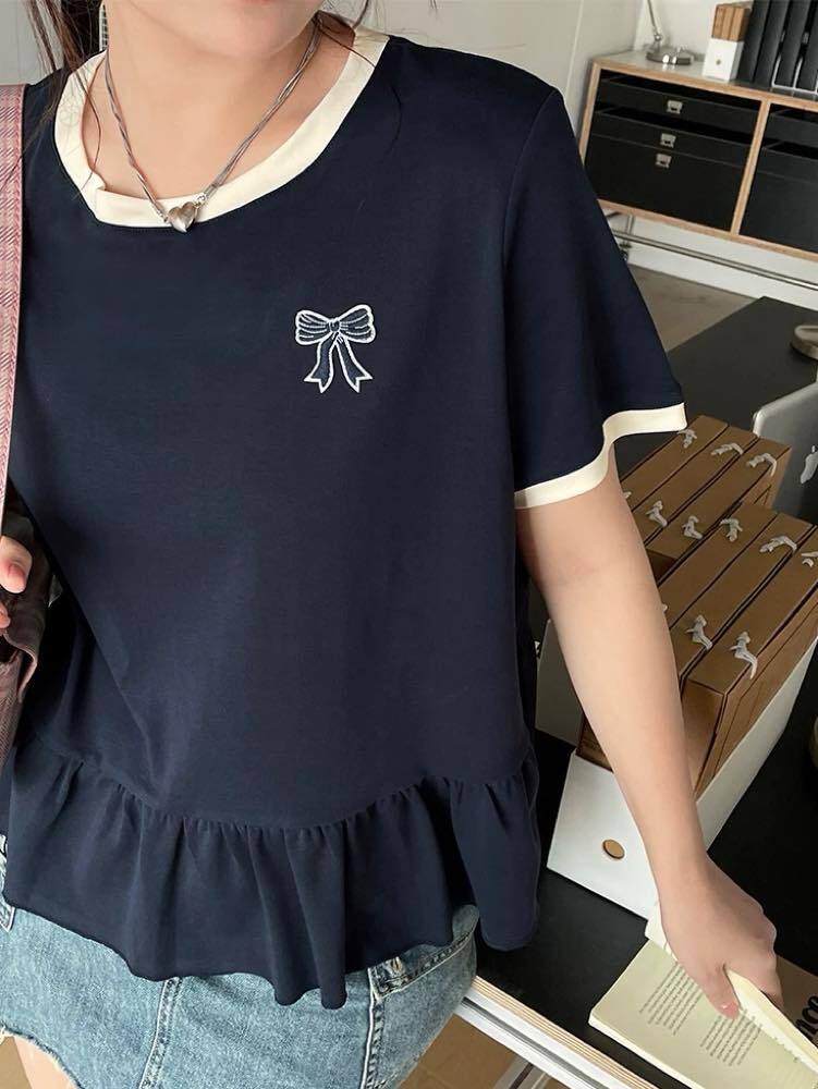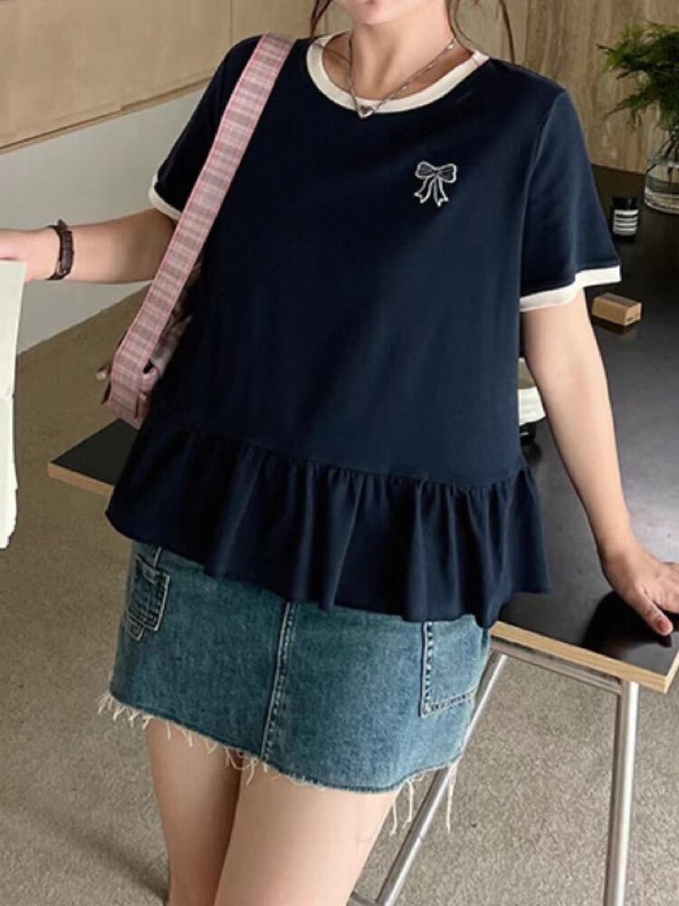 スポカジ×ガーリーのいいとこどり♡ リボン刺繍ペプラムTシャツ 半袖 刺繍 リボン かわいい カジュアル スポーティ フリル 体型カバー 大きいサイズ 韓国 CH10694