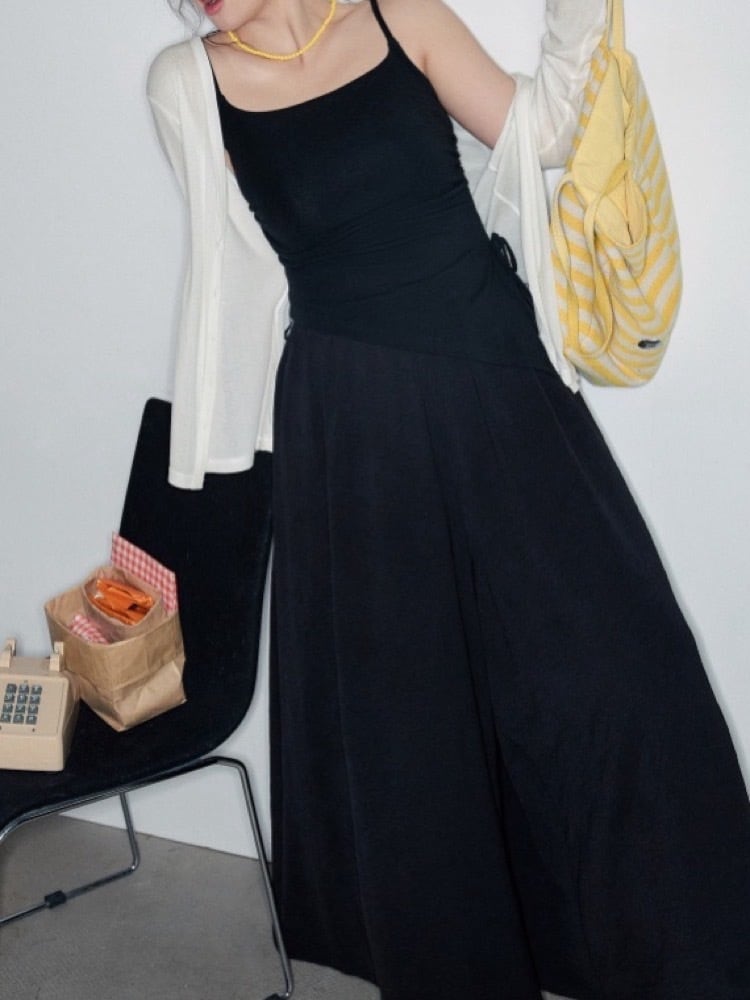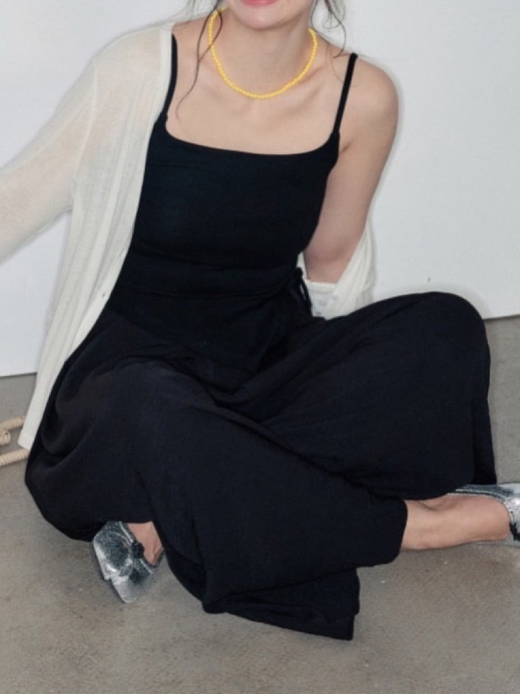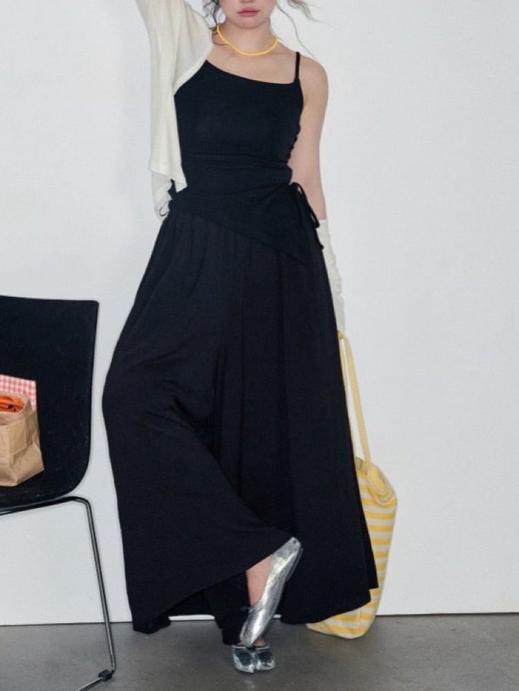リラックスなのに美シルエット ブラックセットアップ キャミソール ワイドパンツ 2点セット 春夏 お洒落 カジュアル おでかけ 肌見せ 体型カバー 大きいサイズ 韓国 CH10761