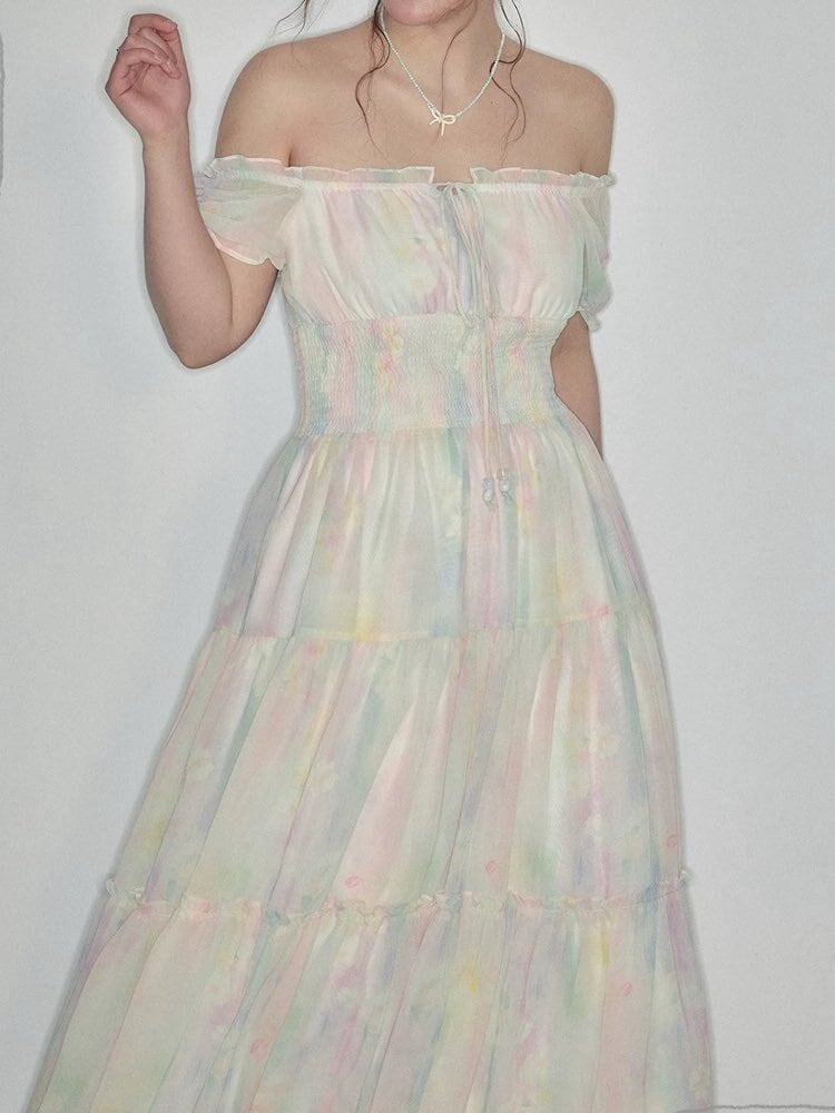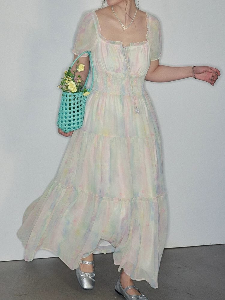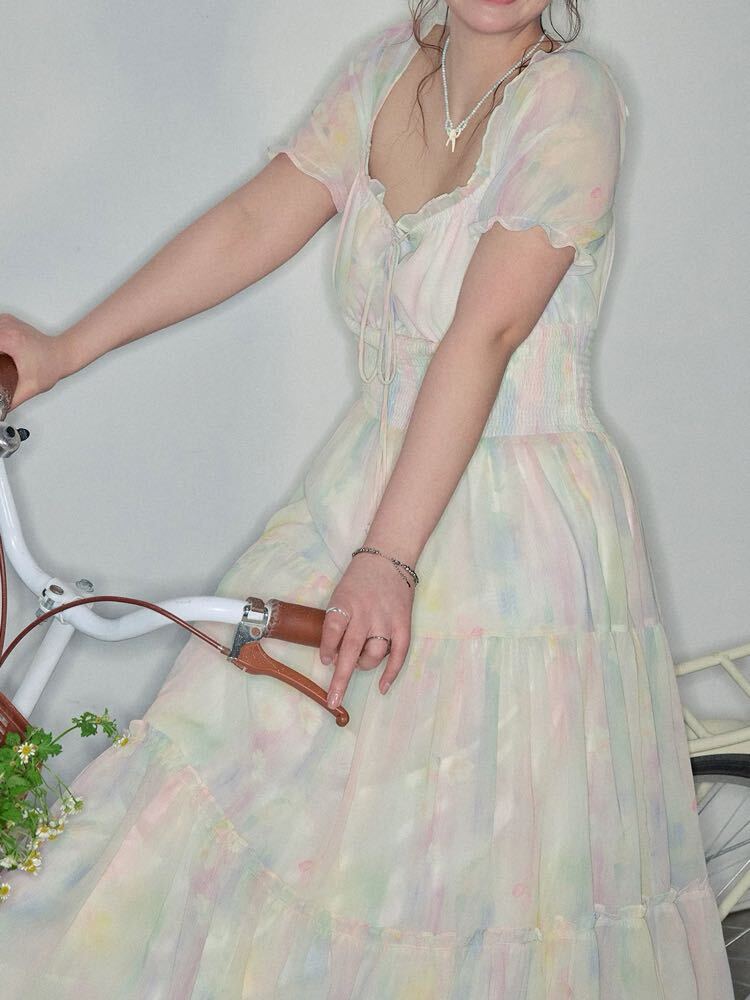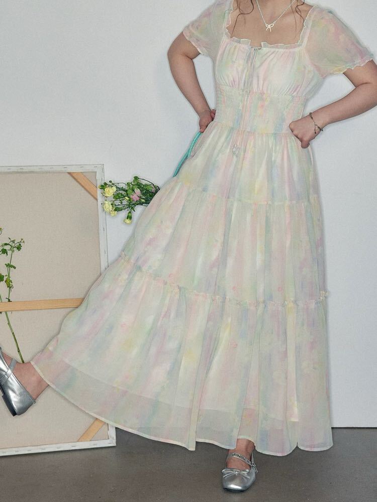 甘さを味方に上品に着こなす 花柄切替フリルワンピース ロング丈 大人可愛い フリル リボン シャーベットカラー お洒落 フェミニン 上品 着映え デート おでかけ リゾート 体型カバー 大きいサイズ 韓国 CH10797