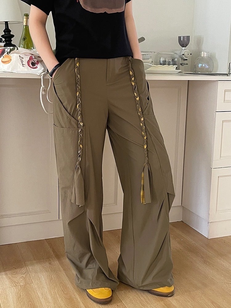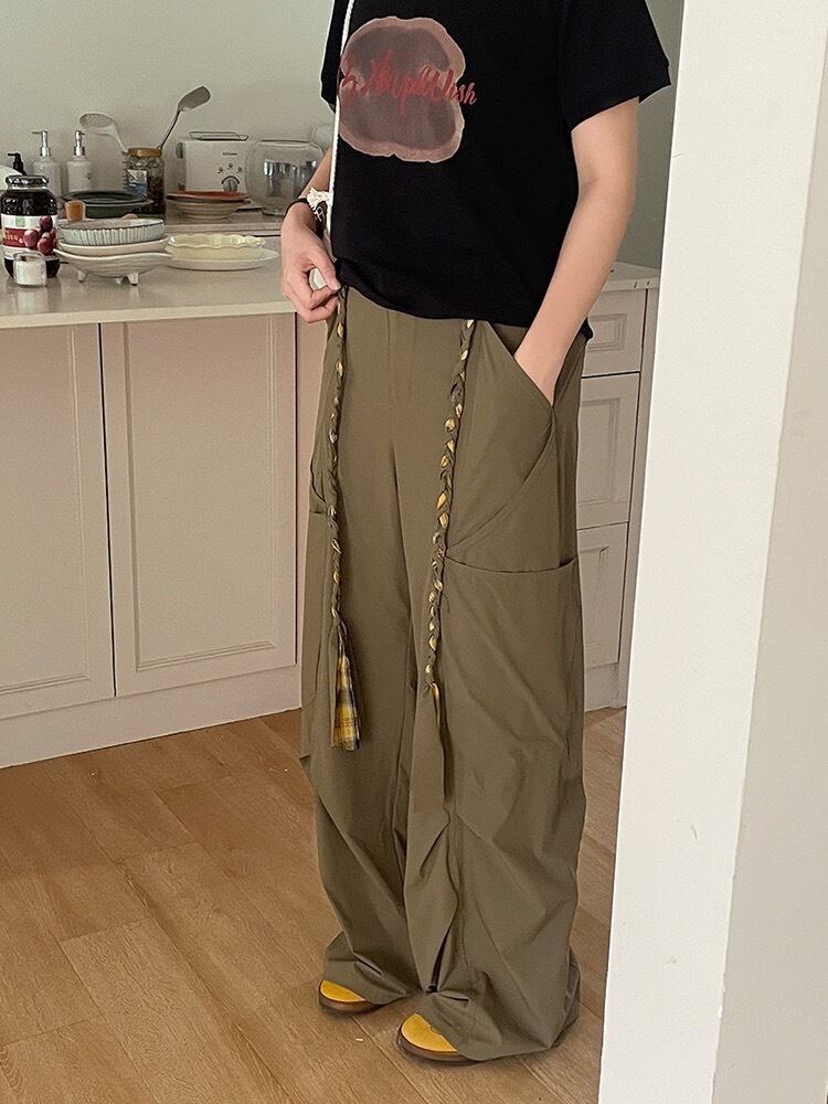ラフに着こなす韓国ストリート 編み紐ベルト付きラップ風ワイドボトム カーゴ ミリタリー お洒落 リラクシー 大人可愛い 差し色 カジュアル きれいめ こなれ感 おでかけ デイリー 体型カバー 大きいサイズ 韓国 CH10860