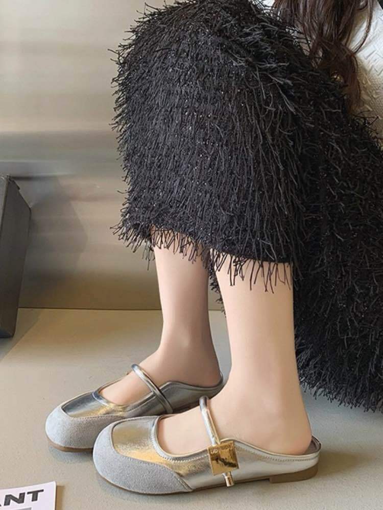 異素材で魅せるおしゃサンダル メタルクロージャースリッポンサンダル 大人可愛い 上品 お洒落 メタリック 異素材 差し色 スクエアトゥ ぺたんこ シンプル スエード ゴールド 大きいサイズ 韓国 CH10850