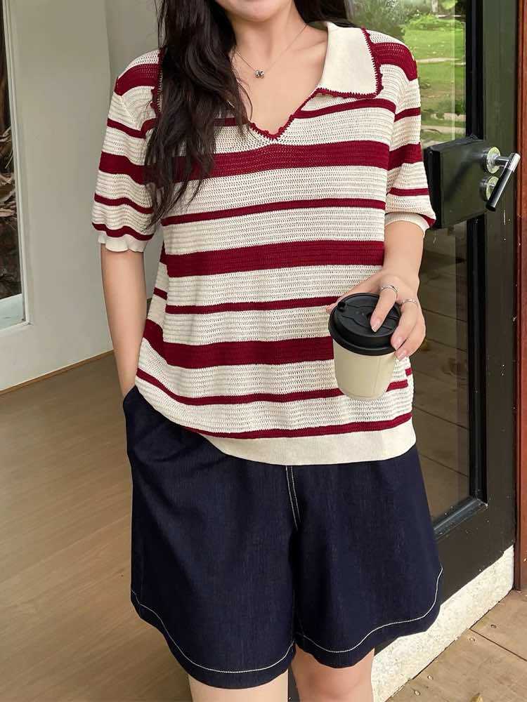 涼しげサマーニットで大人の余裕 ボーダー柄サマーポロニット お洒落 ボーダー バイカラー 大人可愛い カジュアル きれいめ Vネック こなれ感 体型カバー 大きいサイズ 韓国 CH10861