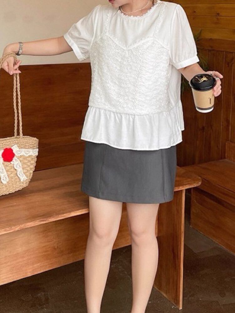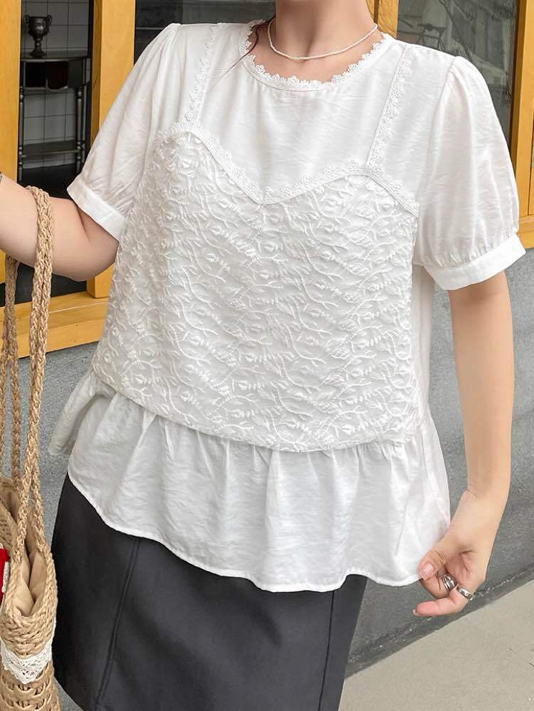 甘さと上品さの良いとこどり レースキャミドッキングペプラムプルオーバー 大人可愛い お洒落 レース 花柄 シアー スリット きれいめ カジュアル 体型カバー 大きいサイズ 韓国 CH10862