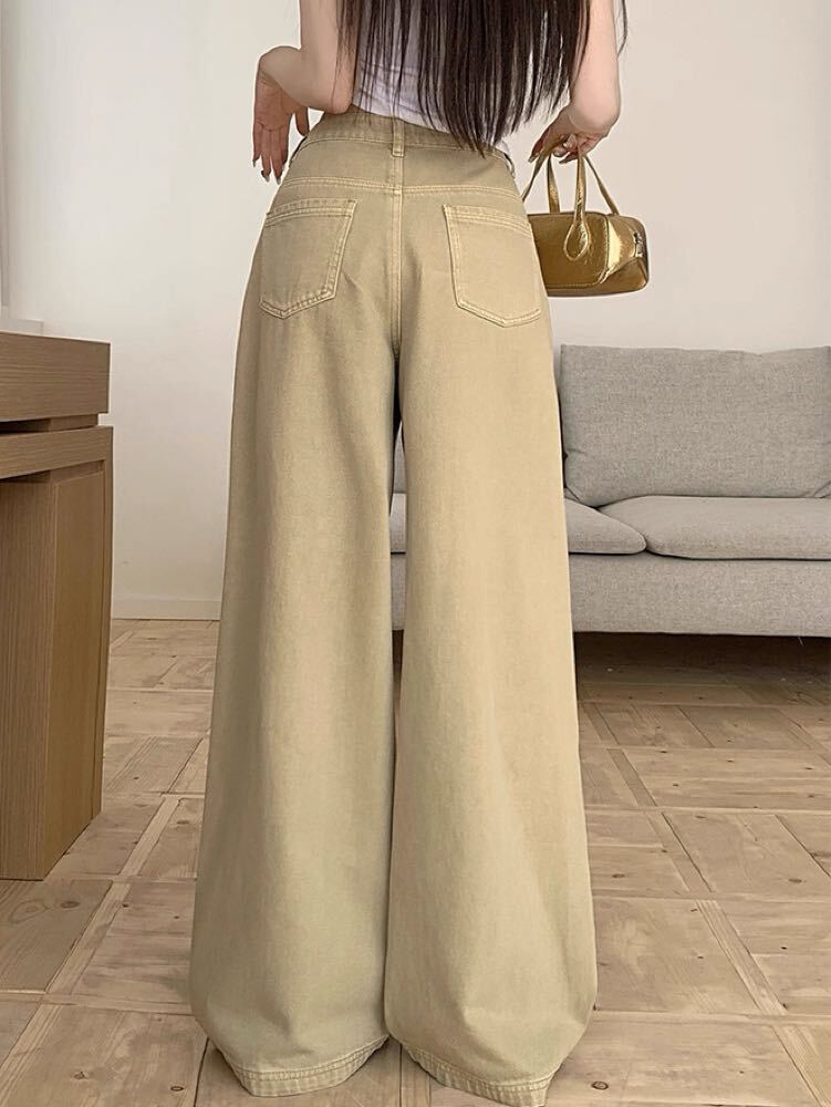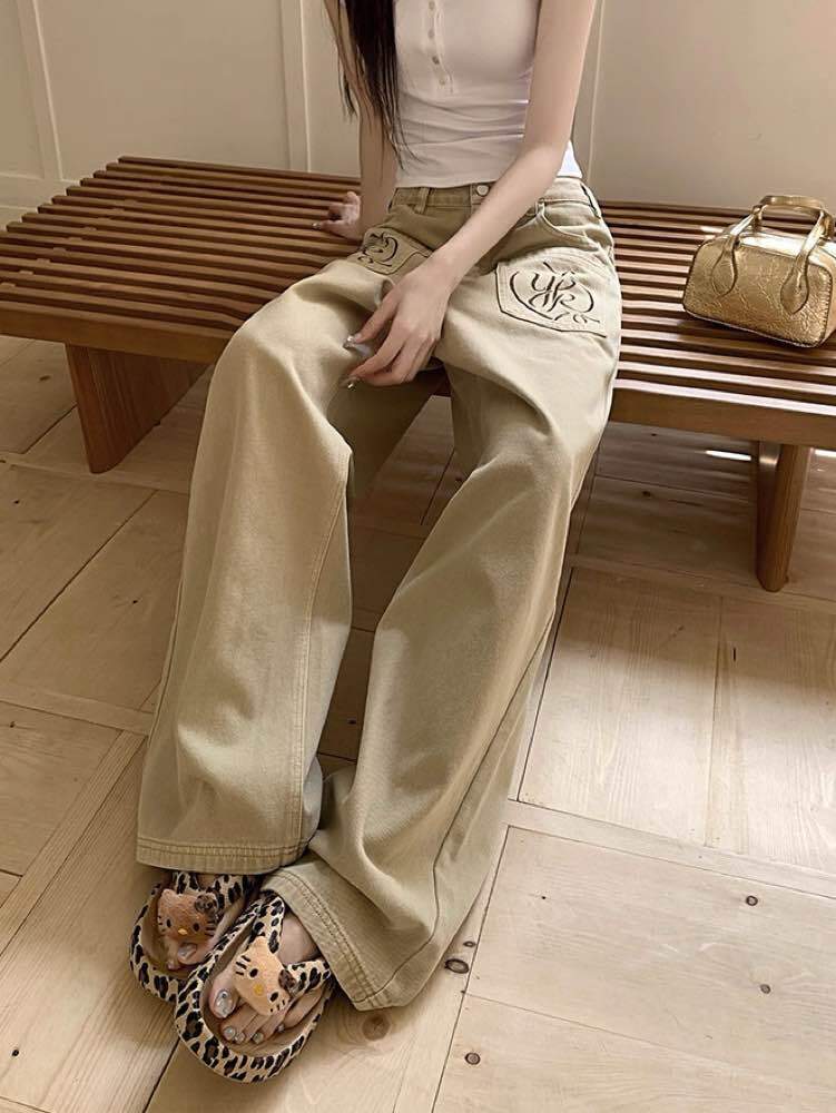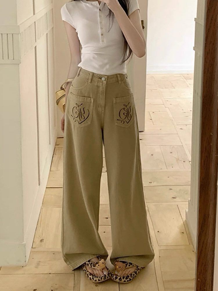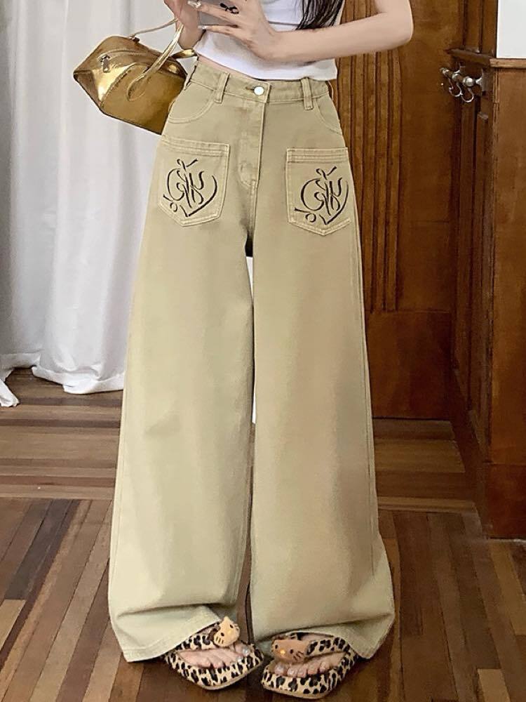 ゆるっと履くだけでこなれ感&スタイルUP 刺繍ポケットワイドカラーデニム お洒落 刺繍 大人可愛い ハイウエスト カジュアル 脚長 美脚 美シルエット 大きいサイズ 韓国 CH10863