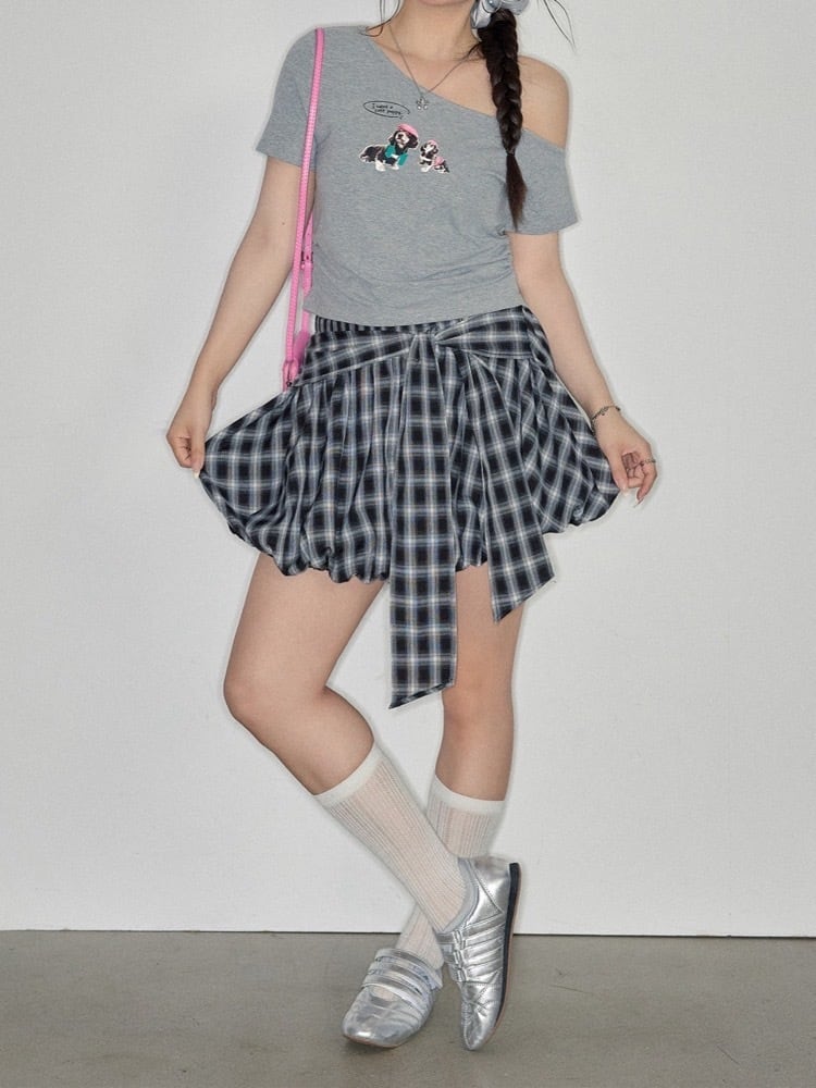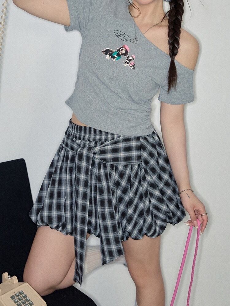 Y2Kガーリーの主役 チェック柄リボン付きバルーンスカパン ウエストリボン ふんわりシルエット トレンド お洒落 可愛い 体型カバー 大きいサイズ 韓国 CH10794