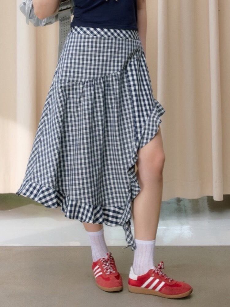 甘めのギンガムチェックに、アシンメトリーなフリルをプラスしたデザインスカート。