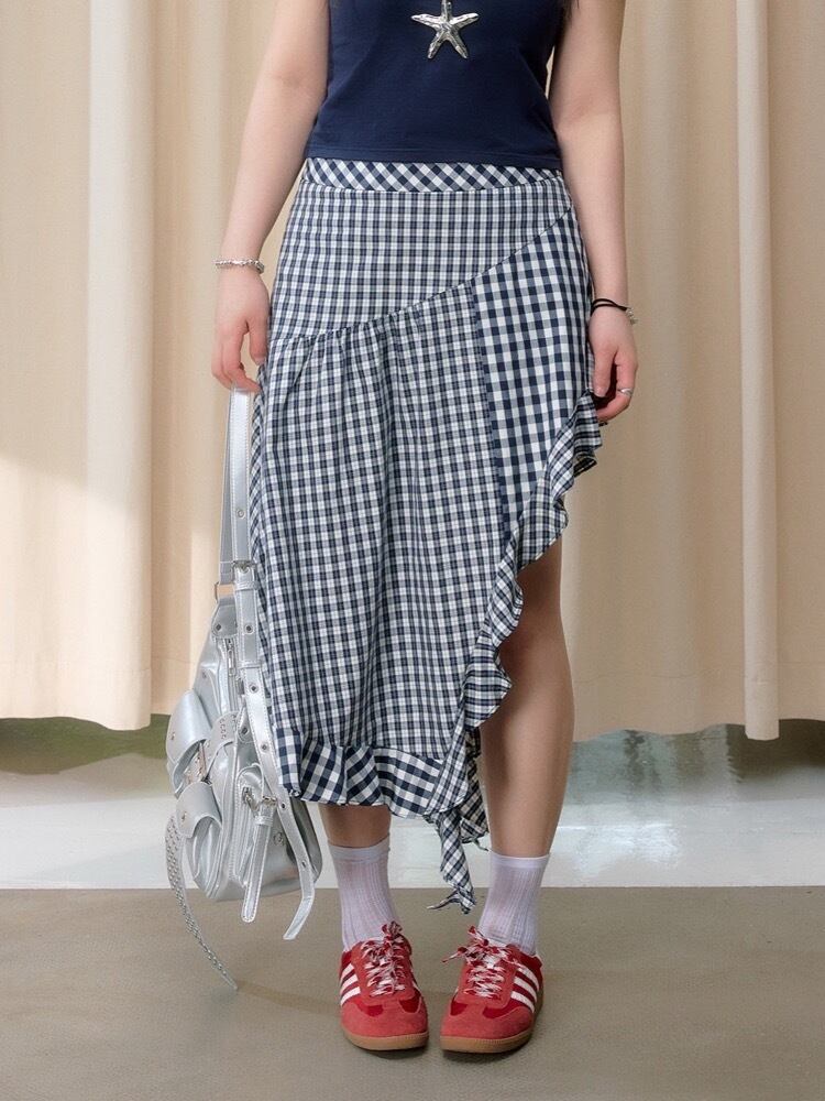 大人の甘辛バランス アシンメトリーギンガムチェックフリルスカート Y2K 細見えトレンド お洒落 可愛い 体型カバー 大きいサイズ 韓国 CH10881
