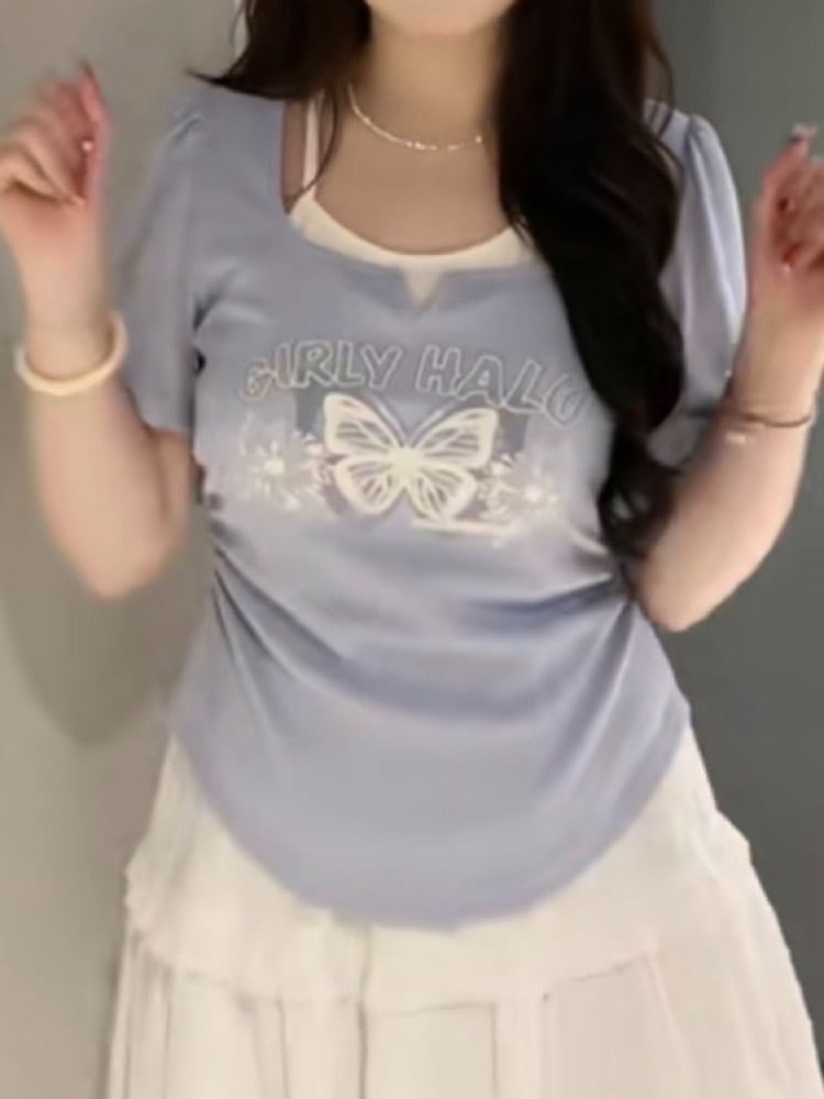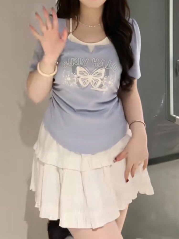 蝶々のプリントが印象的な、韓国風ガーリーストリートTシャツ。