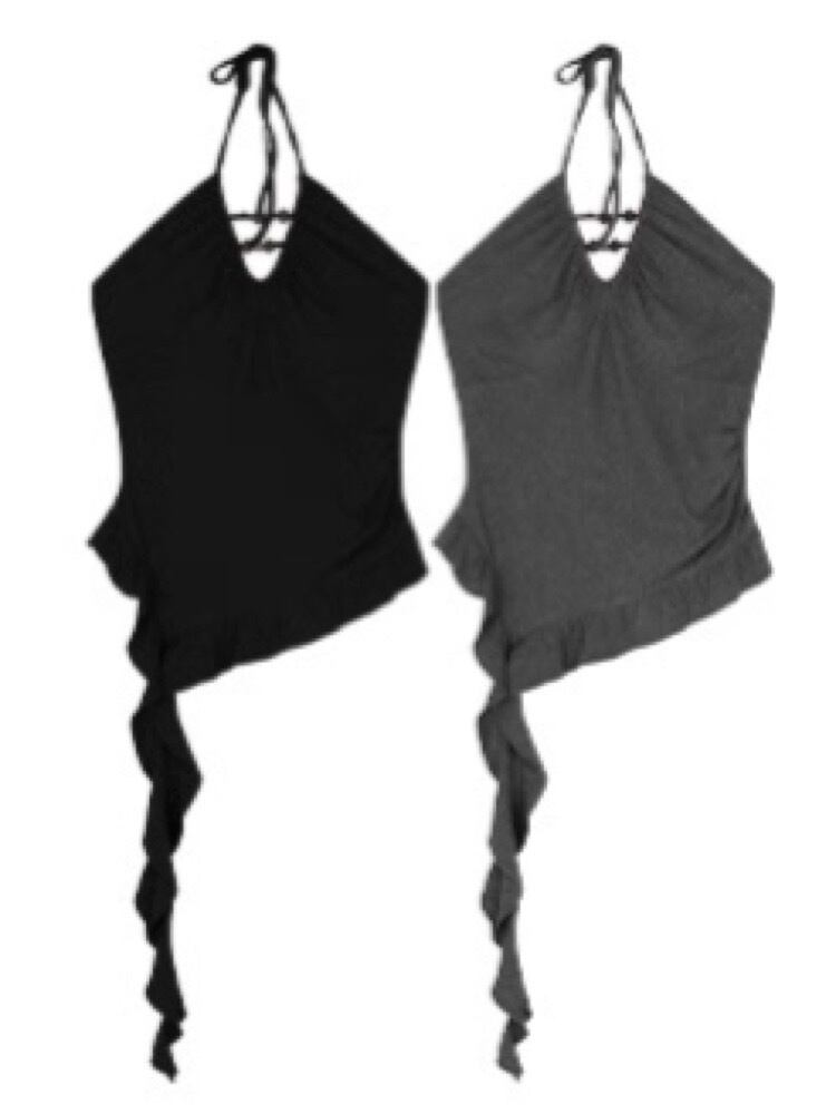 胸元のギャザーが上品なホルターネックキャミと、軽やかな羽織りカーデの2点セット。