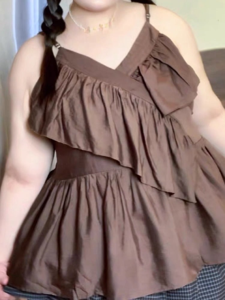 トレンドのブラウンカラーが目を引く、ティアードデザインのキャミソールトップス。