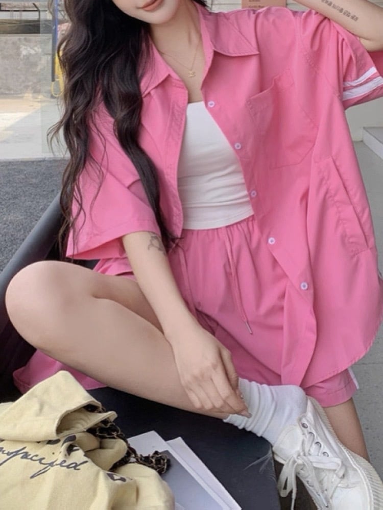 鮮やかなピンクが目を引く、サイドライン入りのシャツ&ショートパンツセットアップ。