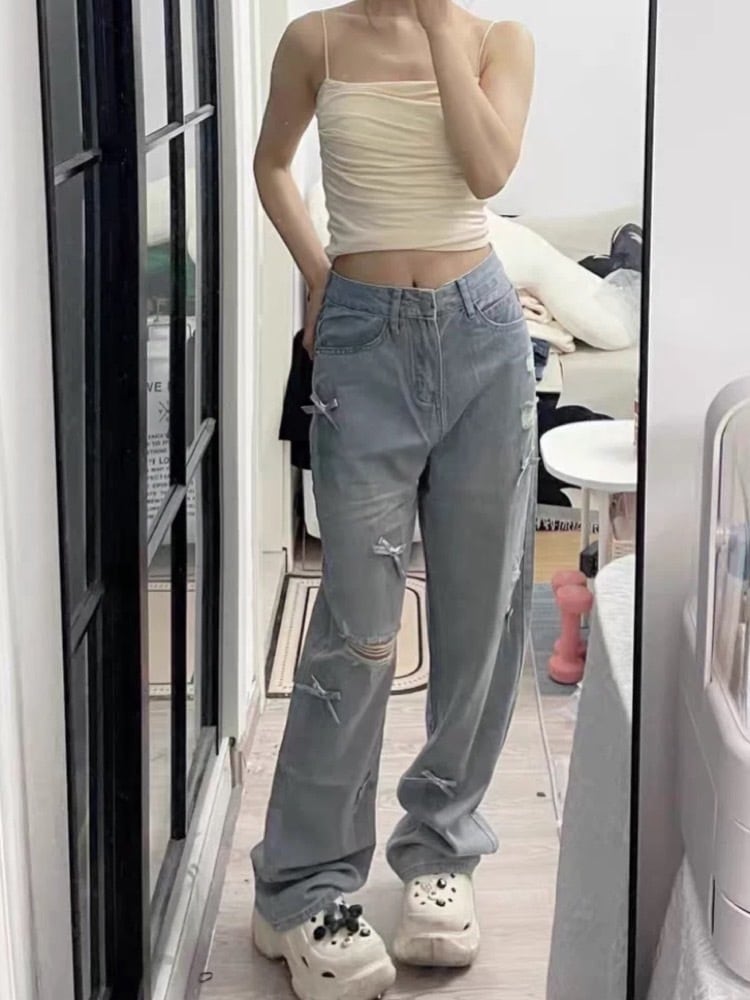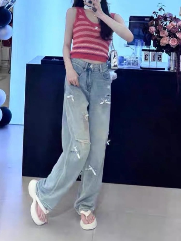 大胆なダメージ加工に、小さなリボンを散りばめたデザインデニム。