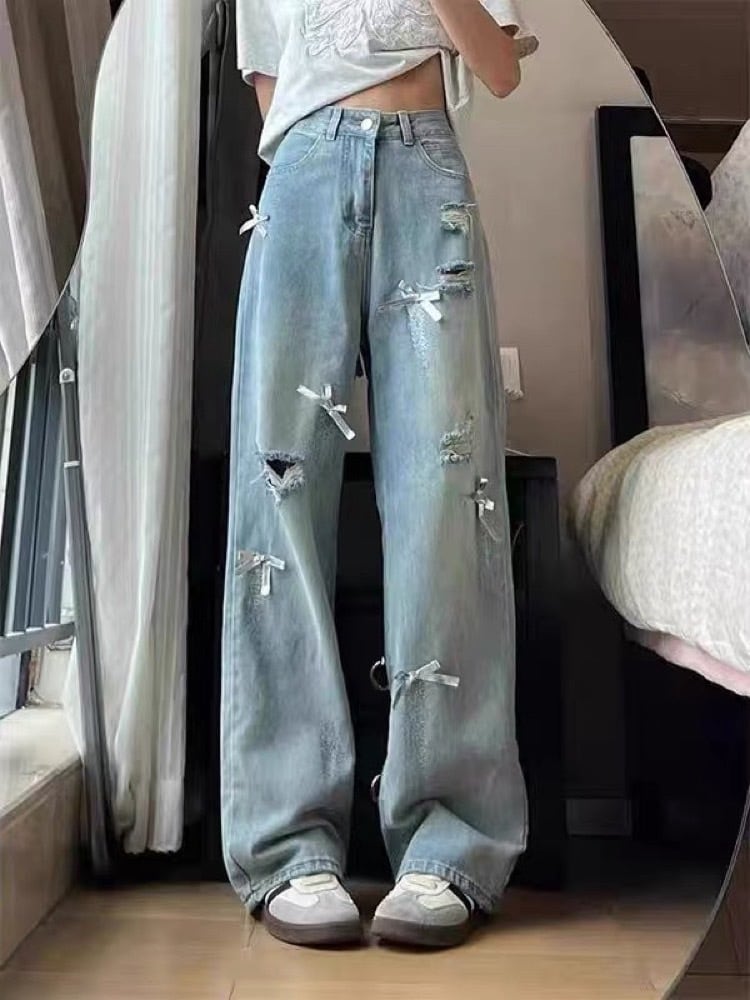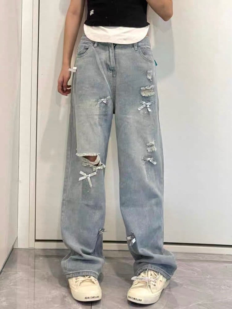 ストリートにガーリーのスパイスを リボン付きダメージワイドパンツ お洒落 大人可愛い カジュアル 脚長 美脚 美シルエット 大きいサイズ 韓国 CH10903