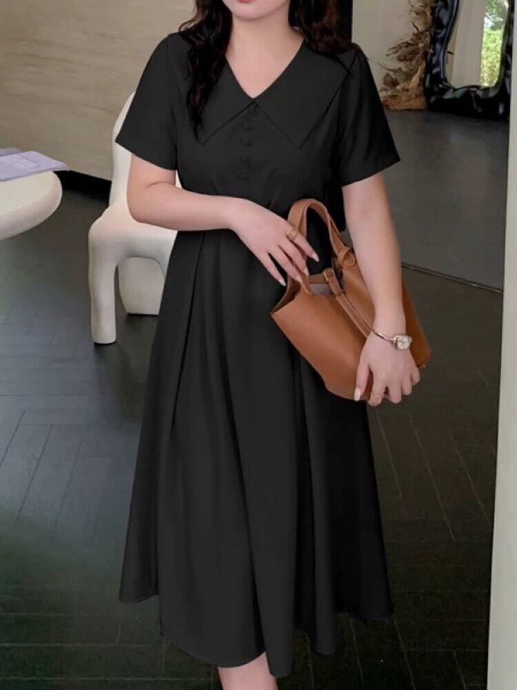 大きめの襟と並んだくるみボタンが上品なアクセントになった、襟付きのきれいめワンピースです♪