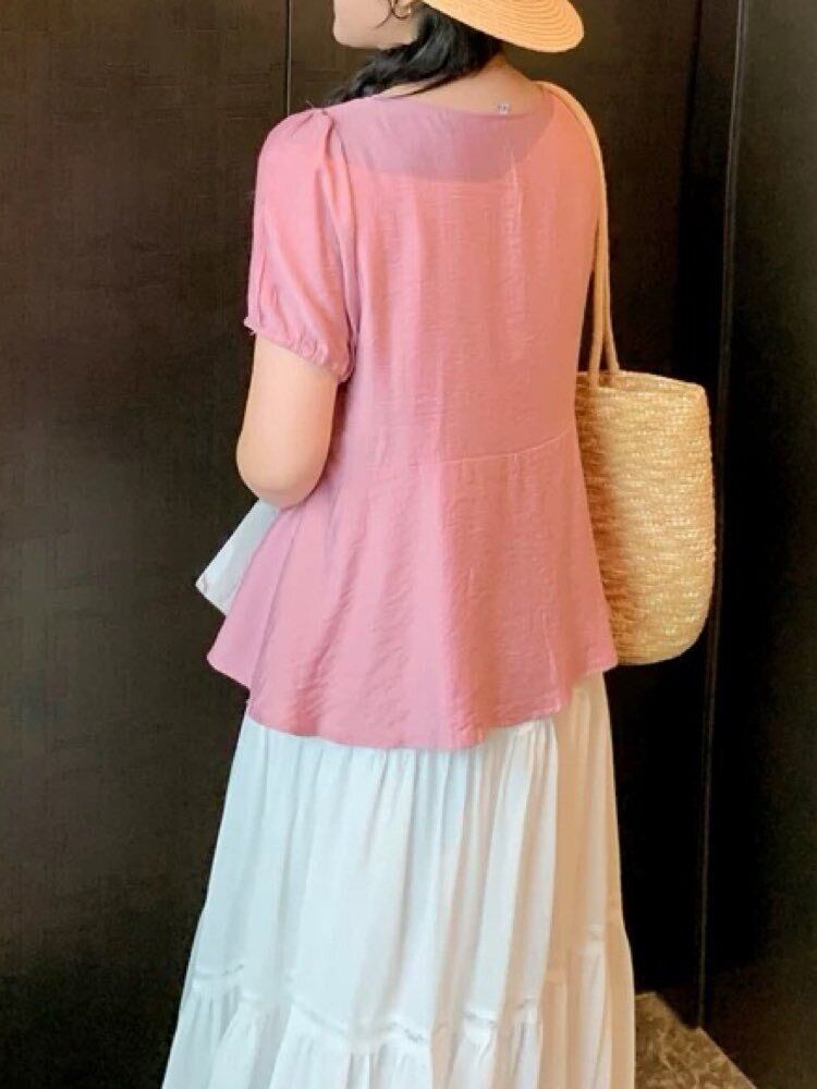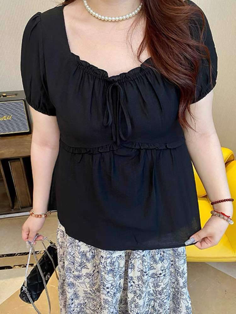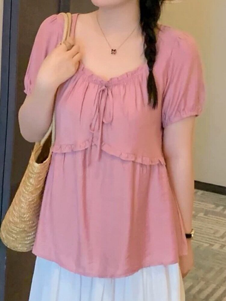 ナチュラルフェミニンで大人の甘さ♡ フリル切替ナチュラルカットソー 半袖 リボン フリル ナチュラル カジュアル ガーリー 体型カバー 大きいサイズ 韓国 CH10871
