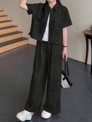 ゆったりシルエットのシャツとワイドパンツがセットになった、抜け感たっぷりの大人カジュアルセットアップ。