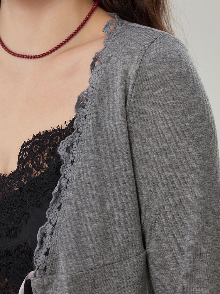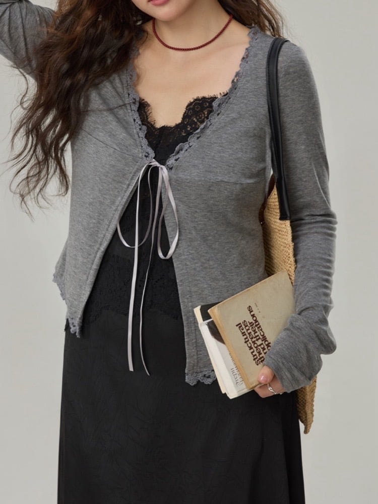 繊細なレーストリムと華奢なリボンがアクセントになった大人可愛いカーディガン。