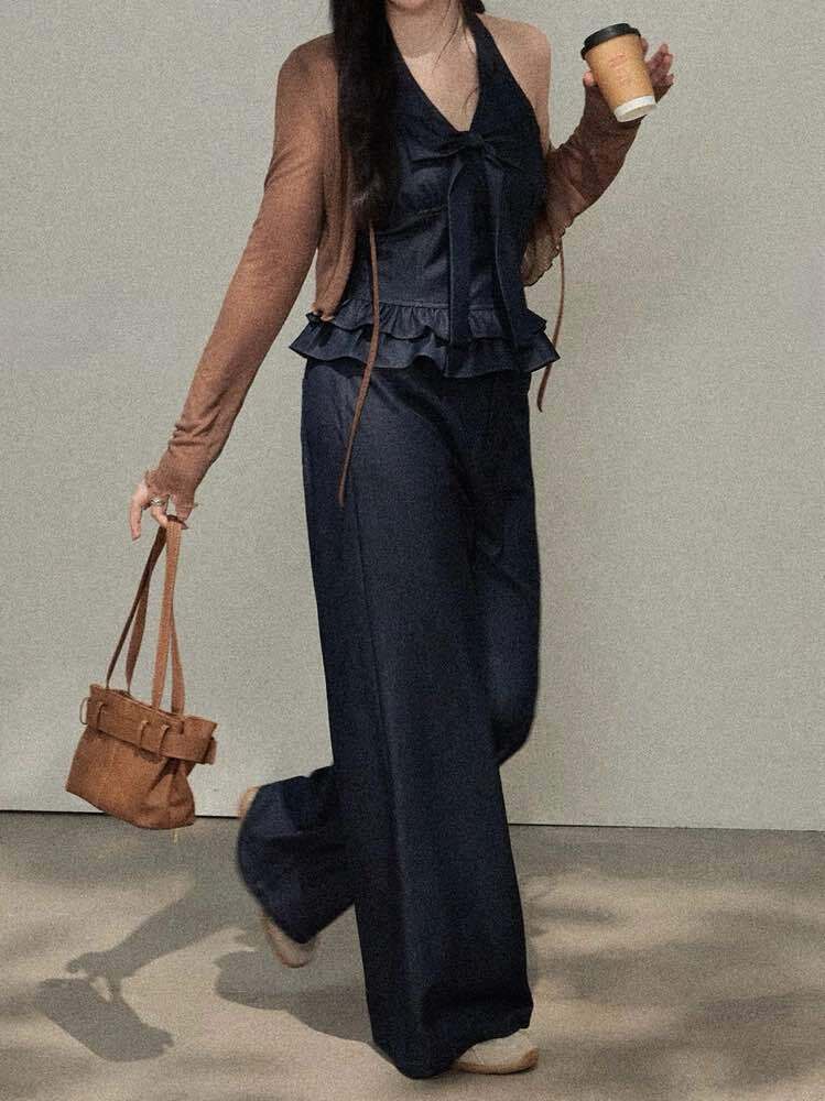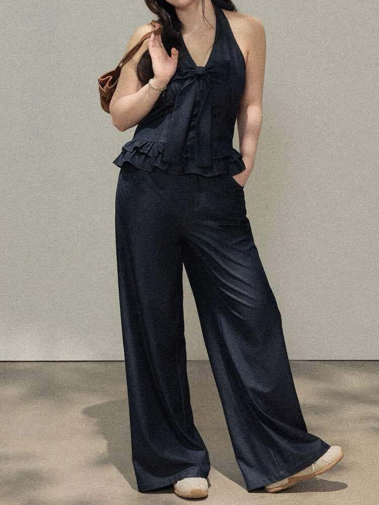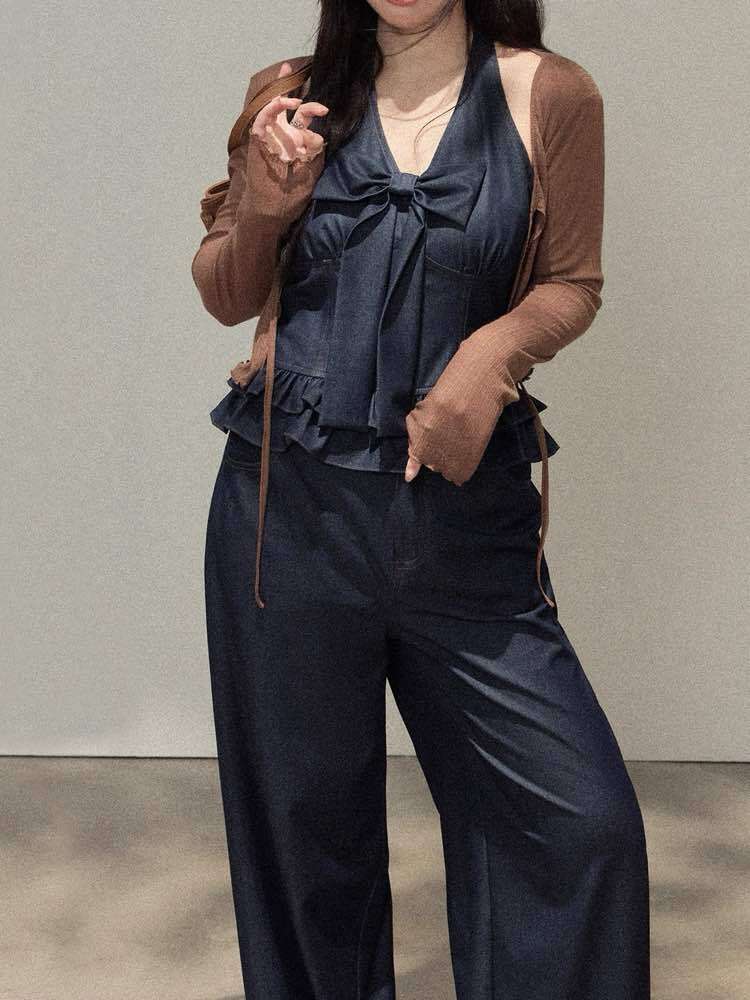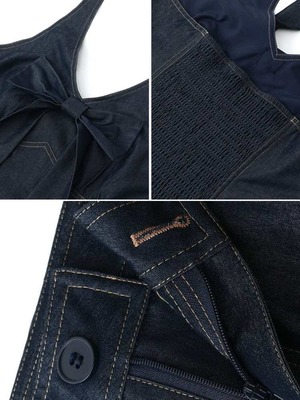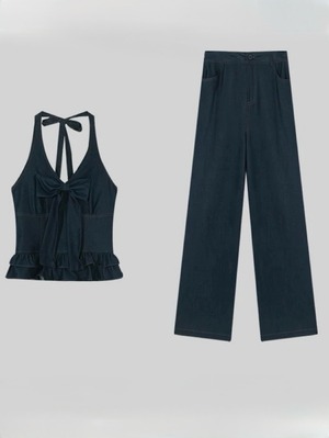 リボン×フリルで大人のガーリーデニムスタイル フロントリボンデニムセットアップ 2点セット デニム リボン フリル ホルターネック セクシー カジュアル きれいめ お洒落 着映え 細見え 大きいサイズ 韓国 CH10927