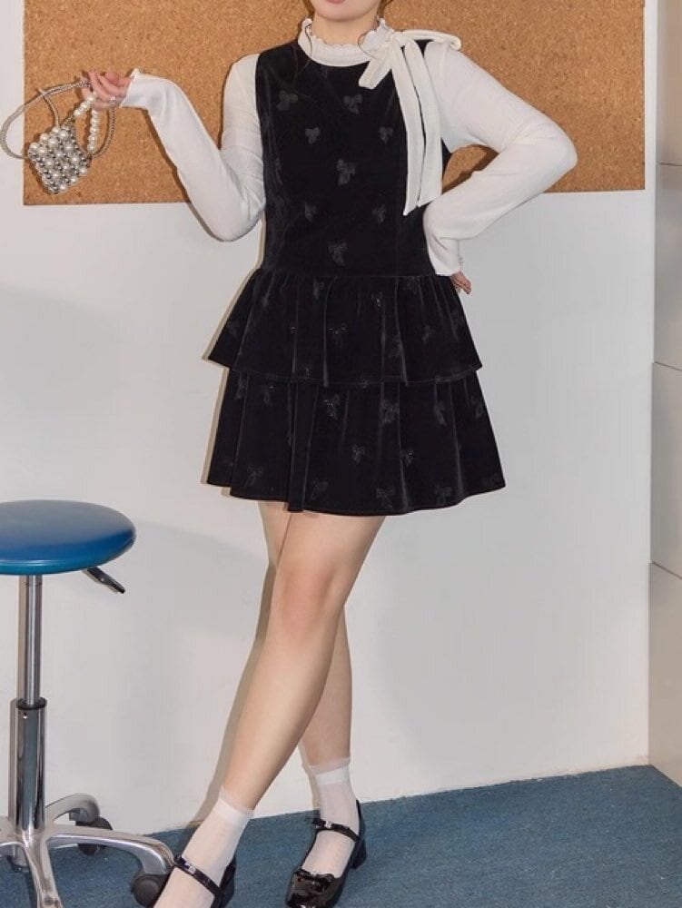 大人可愛さで周囲を魅了♡ リボン柄ベロア調ジャンパースカート リボン柄 ベロア調 秋冬 お洒落 大人可愛い 上品 清楚 クラシカル レトロ ガーリー きれいめ フリル 体型カバー 大きいサイズ 韓国 CH10929