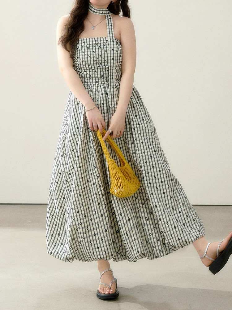 甘さも大人っぽさもゆずれない チェック柄チューブトップバルーンワンピース チェック柄 ドット柄 花柄 モノトーン お洒落 大人可愛い ガーリー カジュアル ロング丈 Aライン くびれ 細見え 脚長 大きいサイズ 韓国 CH10931