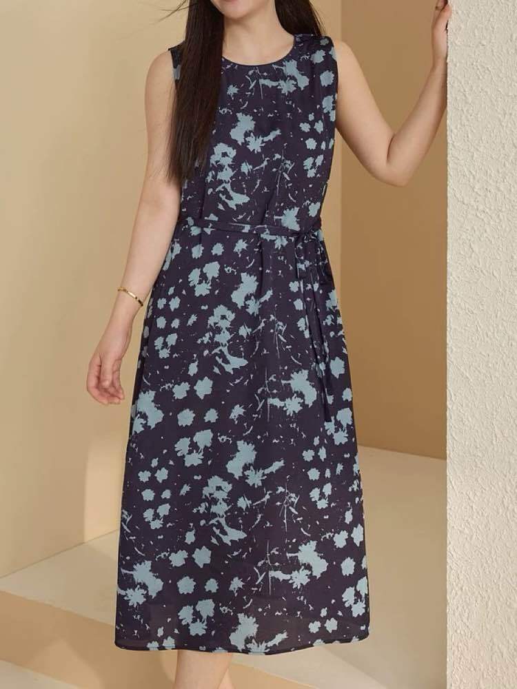 フェミニンなニュアンス柄と上品なネイビーカラーで、お呼ばれやパーティにもおすすめの大人っぽノースリーブワンピース♡