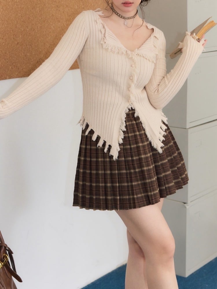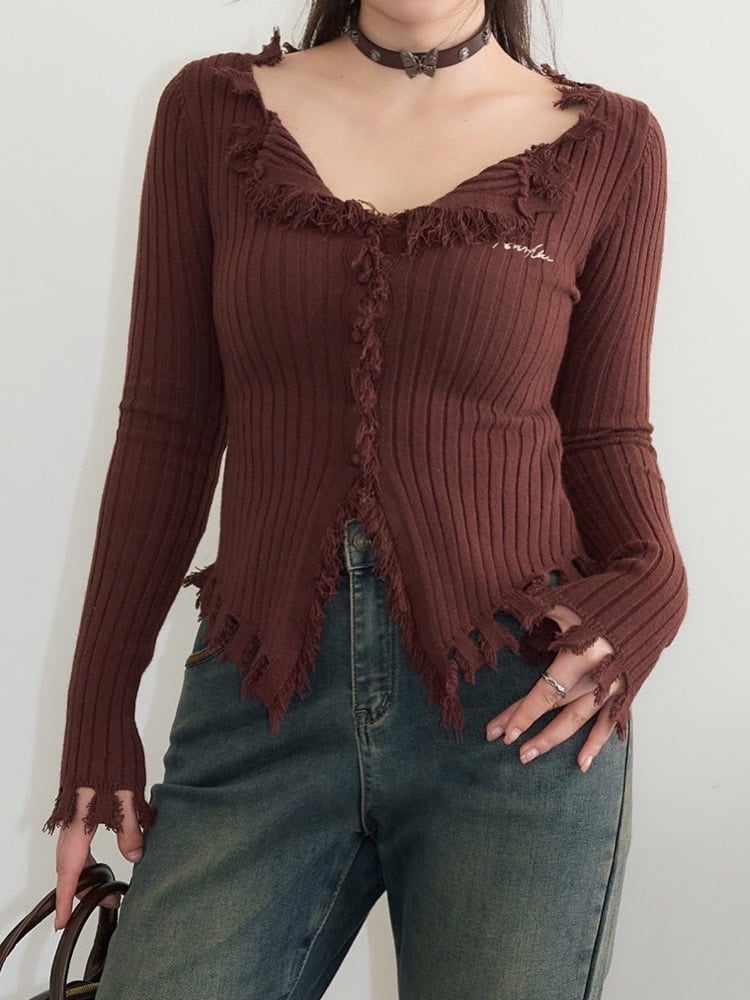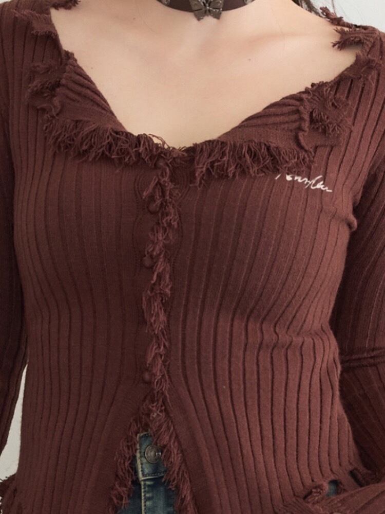 "フリンジデザイン付きVネックリブニットカーディガン"