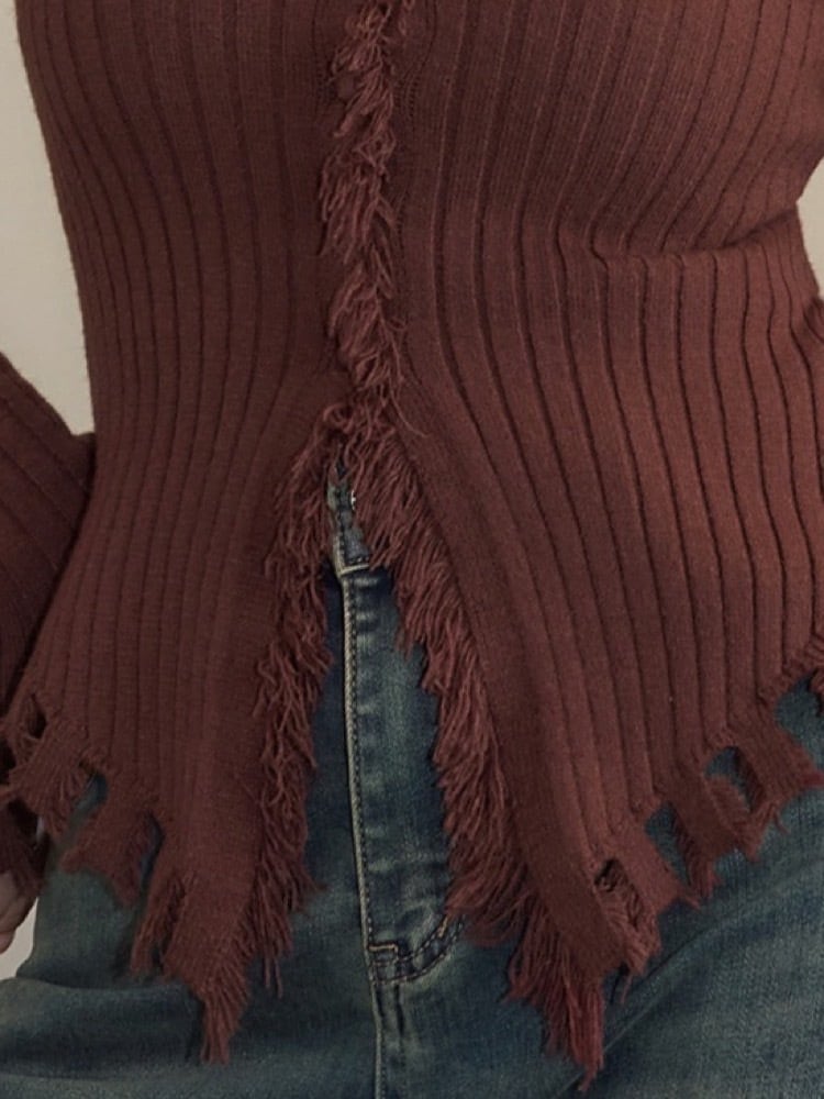 シンプルなリブ素材に、裾やネックラインのフリンジがプラスされることで、他にはない存在感を演出します。