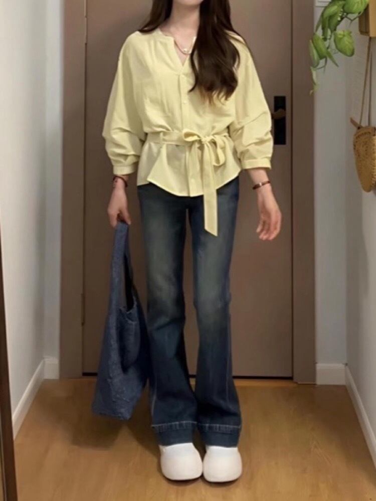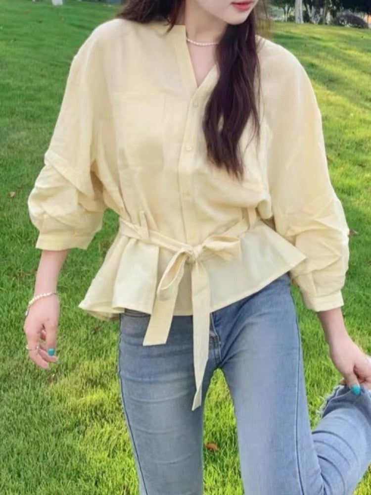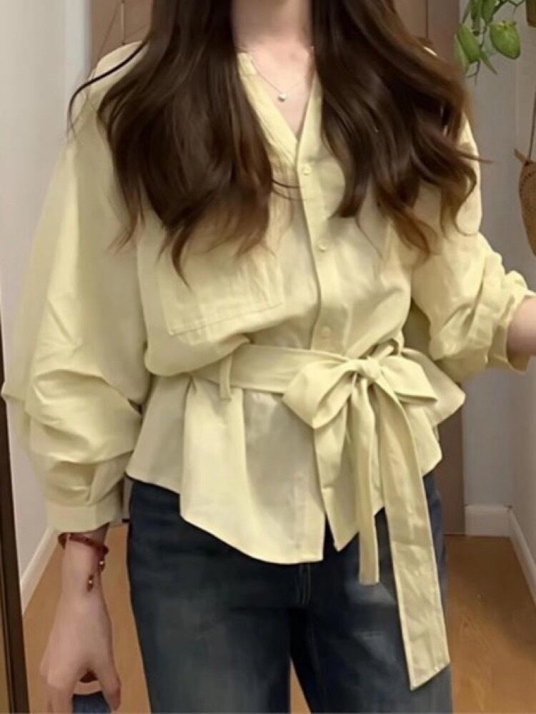 ゆるシルエットで着心地抜群 ウエストリボン付きシャツ 大人可愛い 通勤 オフィス OL 大人可愛い お洒落 体型カバー 大きいサイズ 韓国 CH10947