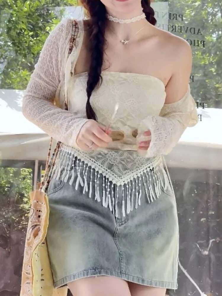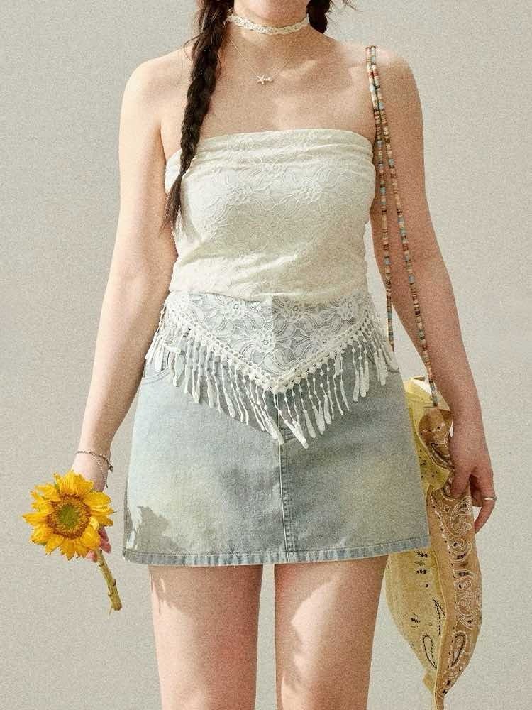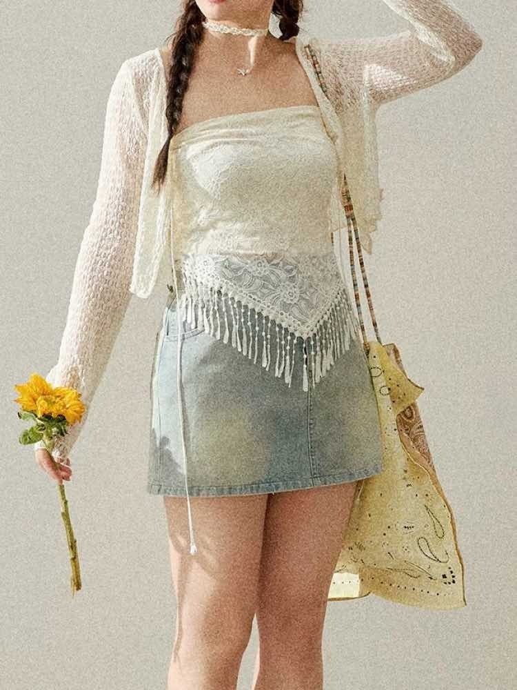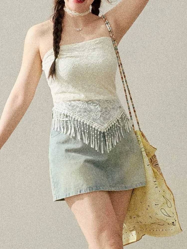 繊細なレースと裾のフリンジディテールが視線を集め、さらっと着こなすだけでこなれ感を演出!