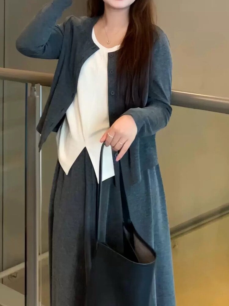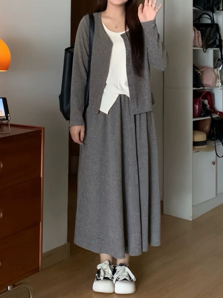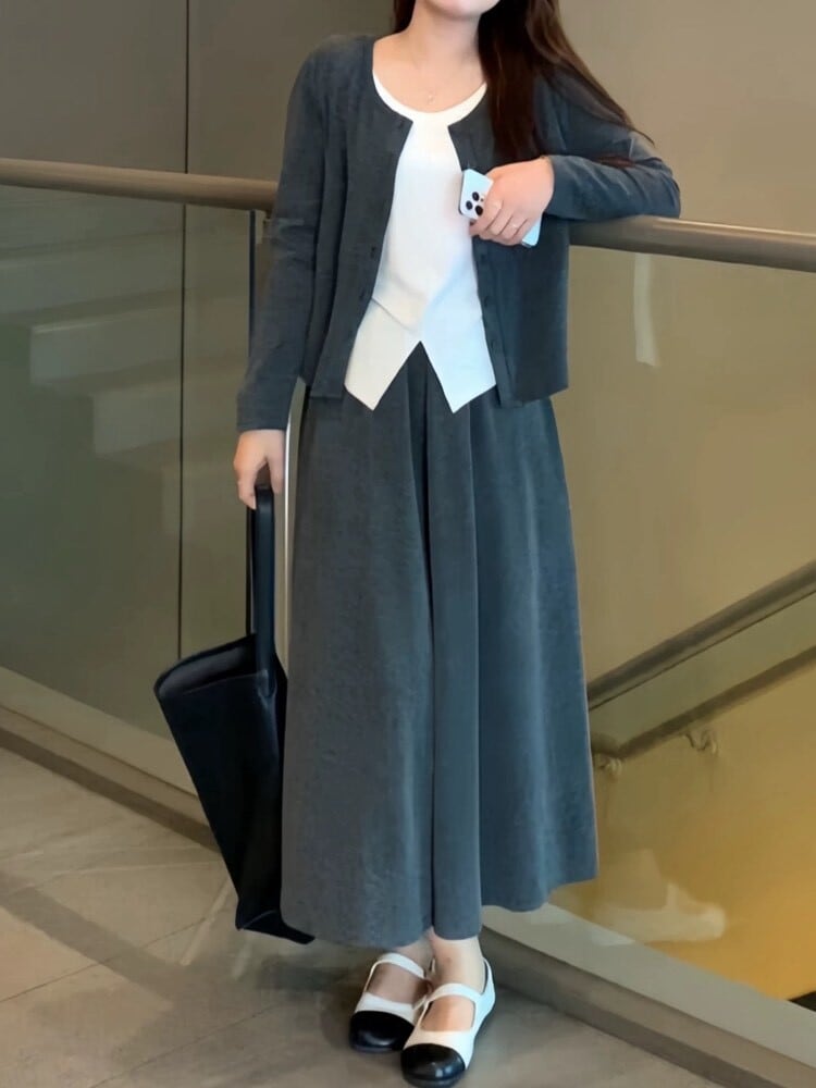 くつろぎもお洒落もこのセットで叶える リブカーディガン×Aラインフレアスカート セット シンプル 大人可愛い お洒落 カジュアル 着回し レイヤード ワンマイル リラクシー 体型カバー 大きいサイズ 韓国 CH10952